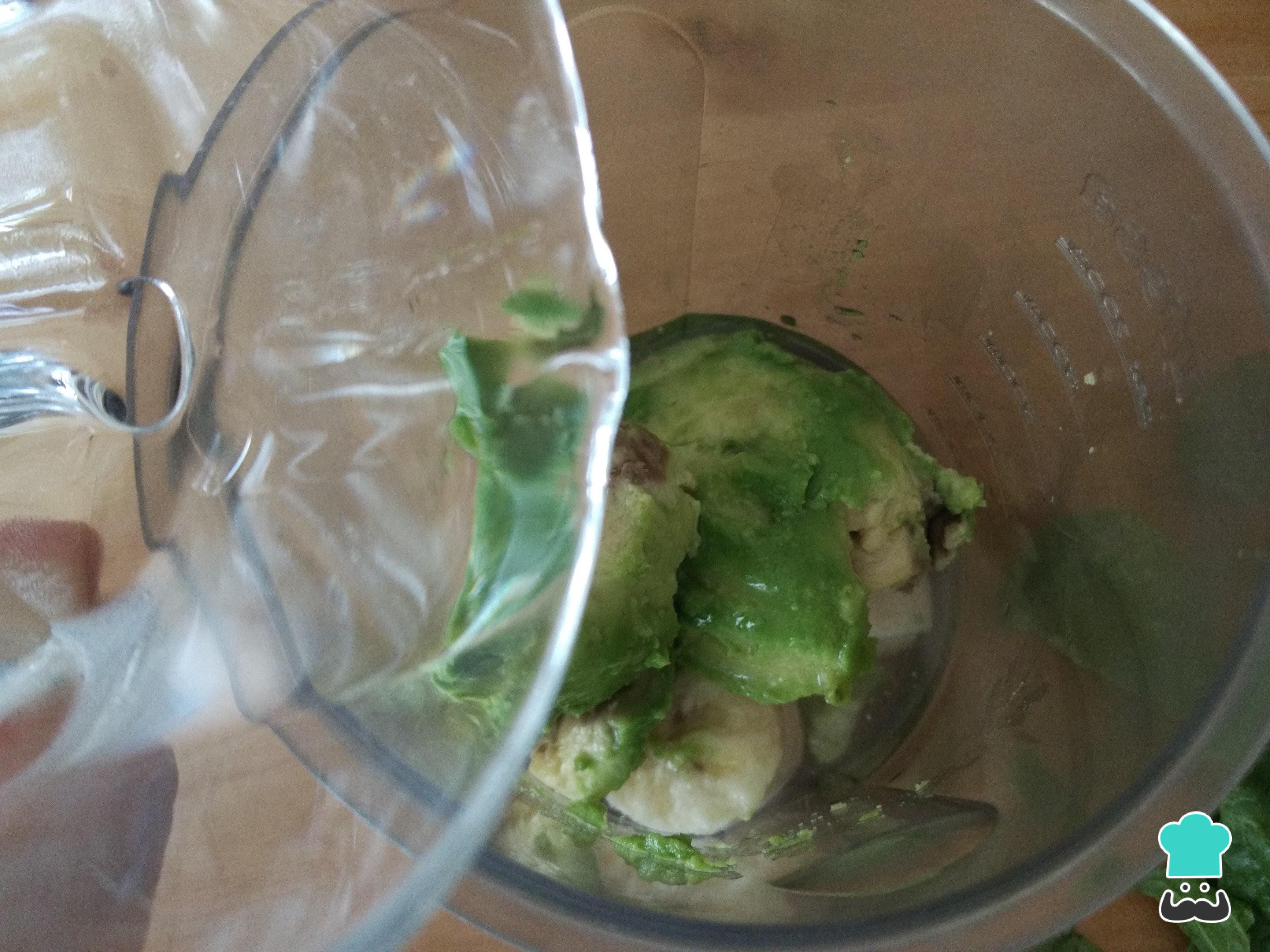 Agregamos el agua fría y comenzamos a batir los ingredientes para el smoothie verde. Si queréis, podéis sustituir el agua por leche de almendras o de avena.