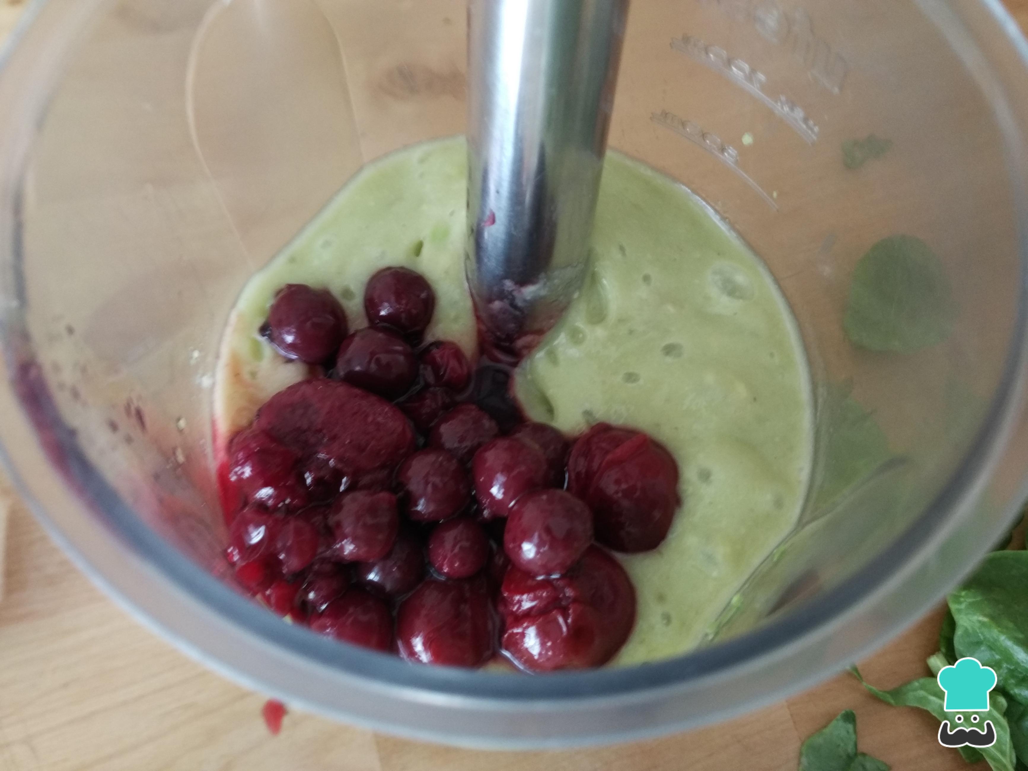 Para que el smoothie verde de aguacate y espinacas quede más fino podéis pasarlo por un colador. Decoramos el smoothie con unas cerezas, arándanos frescos, otra cucharada de frutos rojos y un poco de coco rallado.
