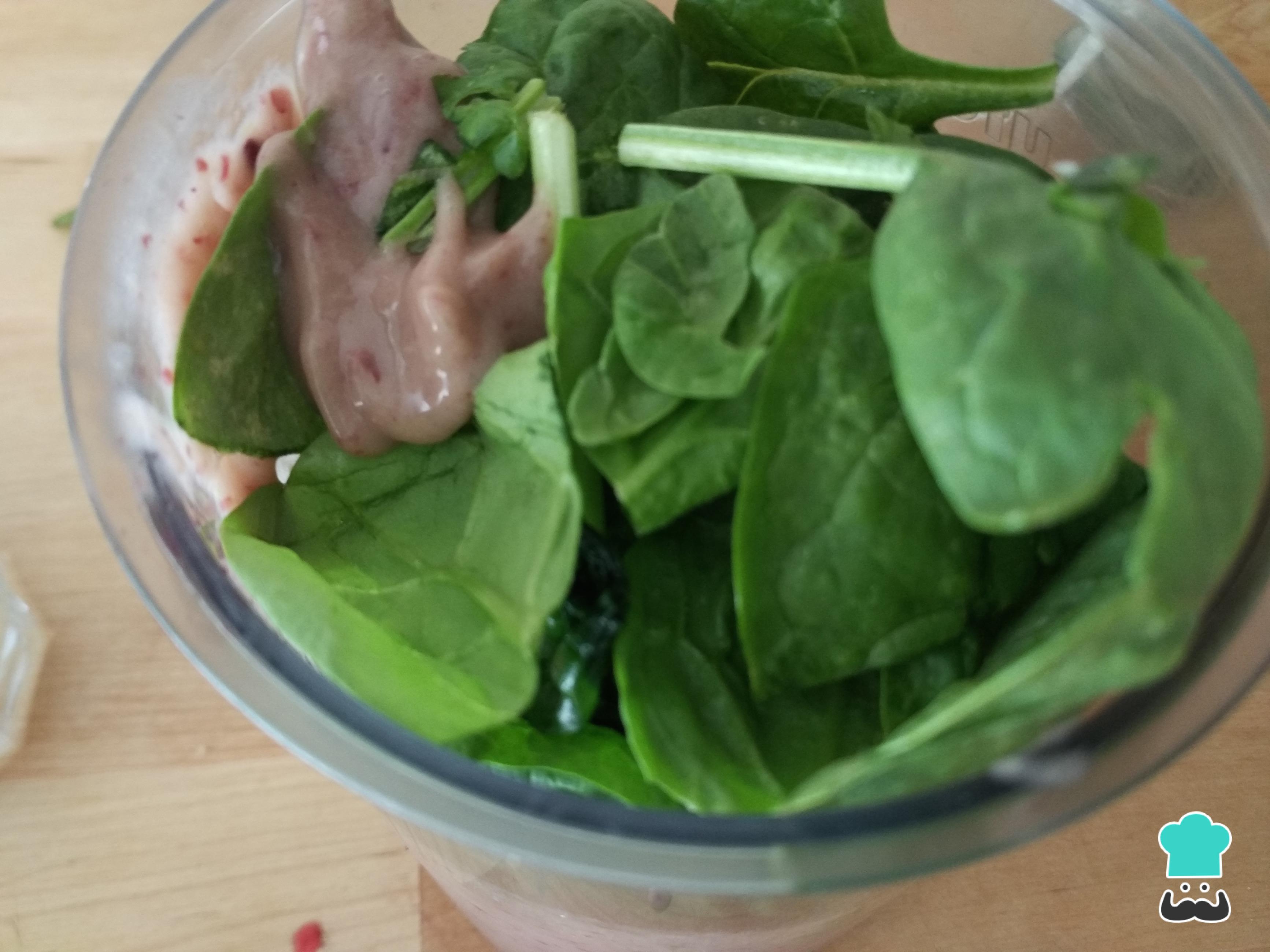 Incorporamos las espinacas frescas y seguimos batiendo hasta eliminar todos los grumos. Si el smoothie detox está muy espeso podemos añadir más agua. Y en el caso de que os gusten los batidos de frutas más dulces, podéis añadir un poco de sirope de agave.