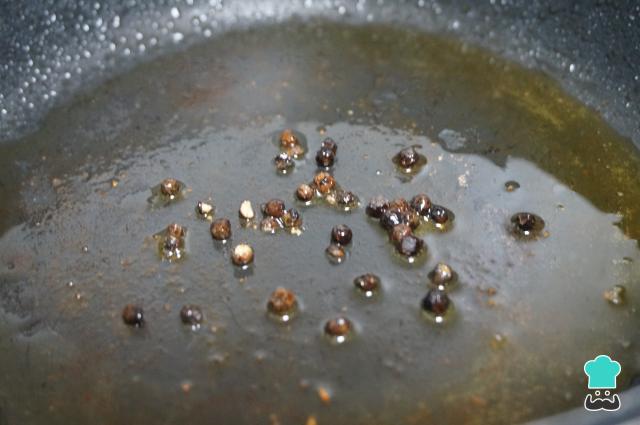 Añade unos cuantos granos de pimienta en la misma cazuela, dóralos unos segundos a fuego medio cuidando que no se quemen.
