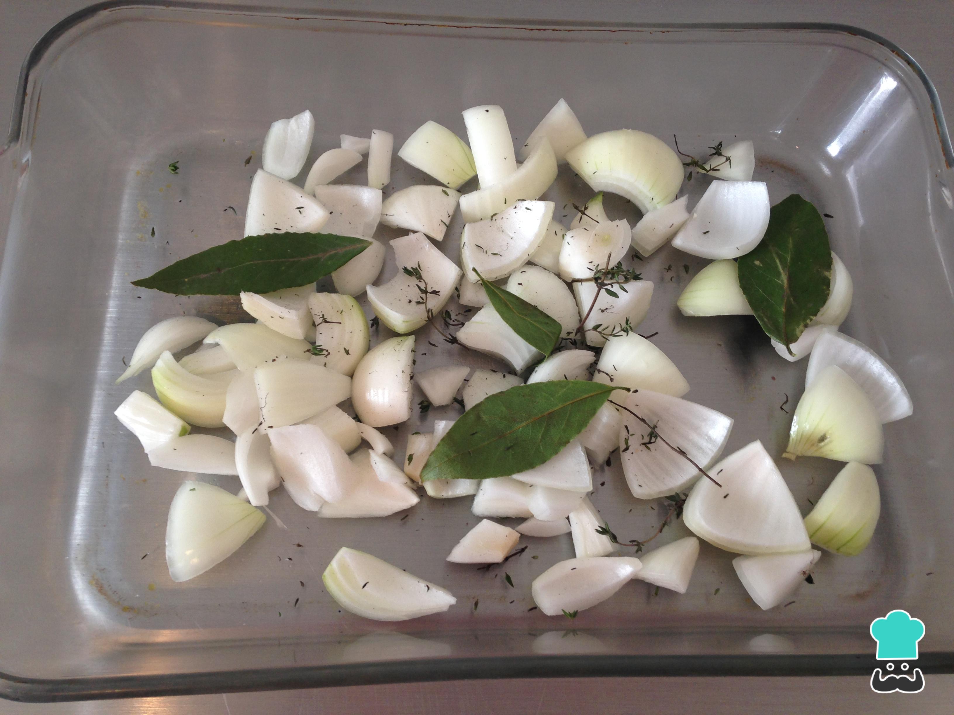 En una refractaria colocar las cebollas cortadas en trozos grandes, y agregar las hojas de laurel y de tomillo.