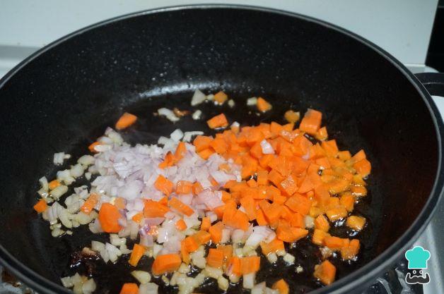 Pica finamente la cebolla y la zanahoria. Luego, en la misma cazuela que has colocado para dorar los solomillos, añade un poco más de aceite e incorpora las verduras picadas. Deja unos minutos que se pochen.