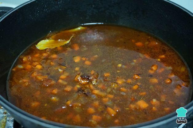 Cuando empiecen a coger color las verduras, añade el ajo picado y la hoja de laurel. Luego, remueve para que se mezcle y añade también el tomate frito. Deja todo un par de minutos con cuidado que no se queme. A continuación, añade el vino negro o blanco y deja unos minutos para que se reduzca el alcohol. Seguido, añade el vaso de agua, un poco de sal y pimienta y deja cocinar la salsa de vino blanco o negro unos 10 minutos.