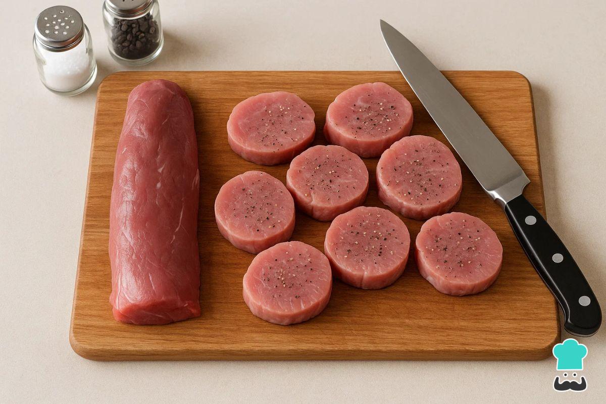 ¿Cómo hacer solomillo al Pedro Ximénez? Empezamos preparando la carne: limpia el solomillo quitando la grasa y los tendones. A continuación, con el solomillo de cerdo limpio, córtalo en medallones de un grosor uniforme para que pueda cocinarse de forma homogénea y salpimiéntalos al gusto.