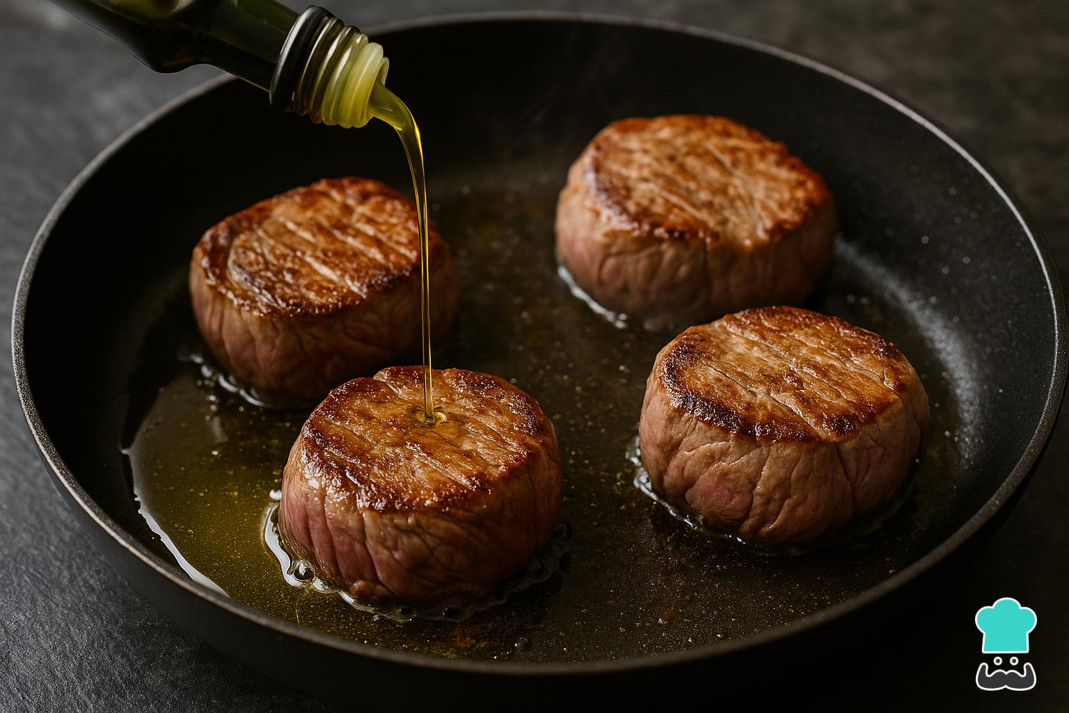Agrega un chorro de aceite de oliva virgen extra en una sartén a fuego fuerte y sella el solomillo, marcando los medallones por ambos lados hasta que estén dorados. Reserva.