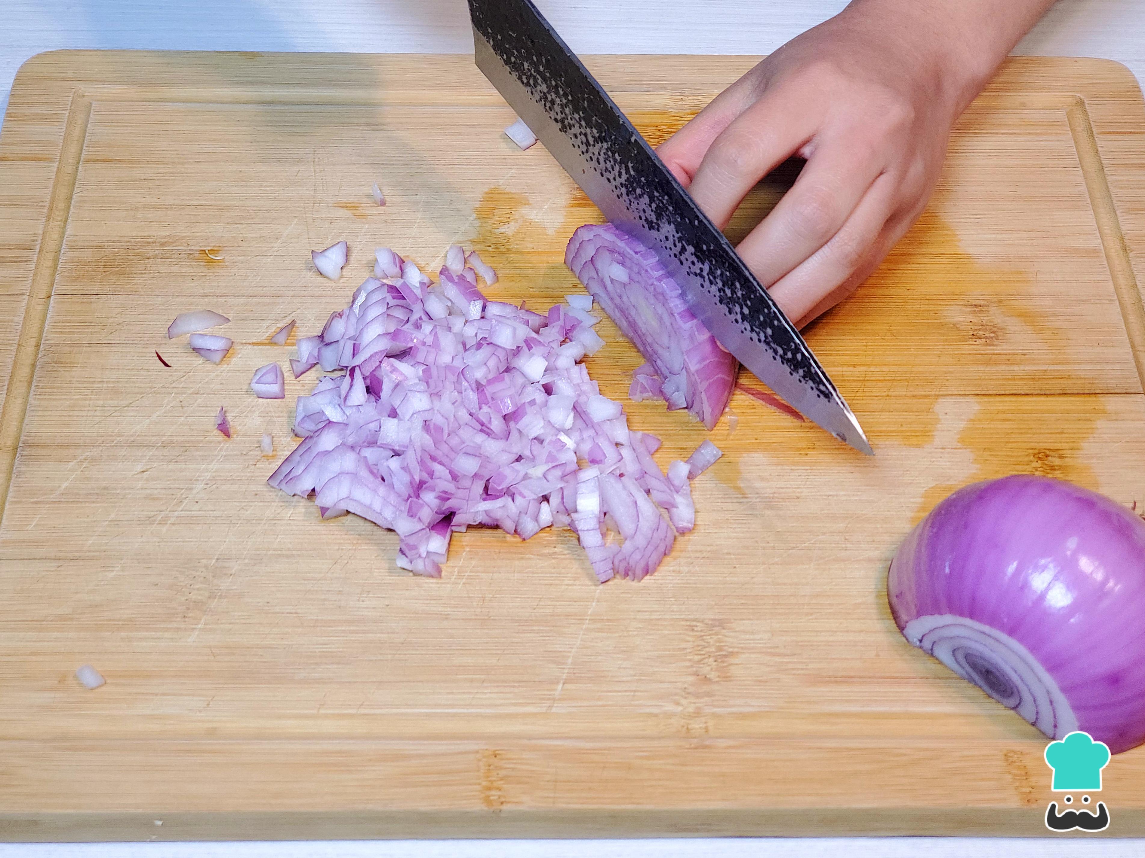 Truco: si consideras que la cebolla está muy fuerte, déjala remojando en agua helada mientras terminas de picar el resto de los insumos.