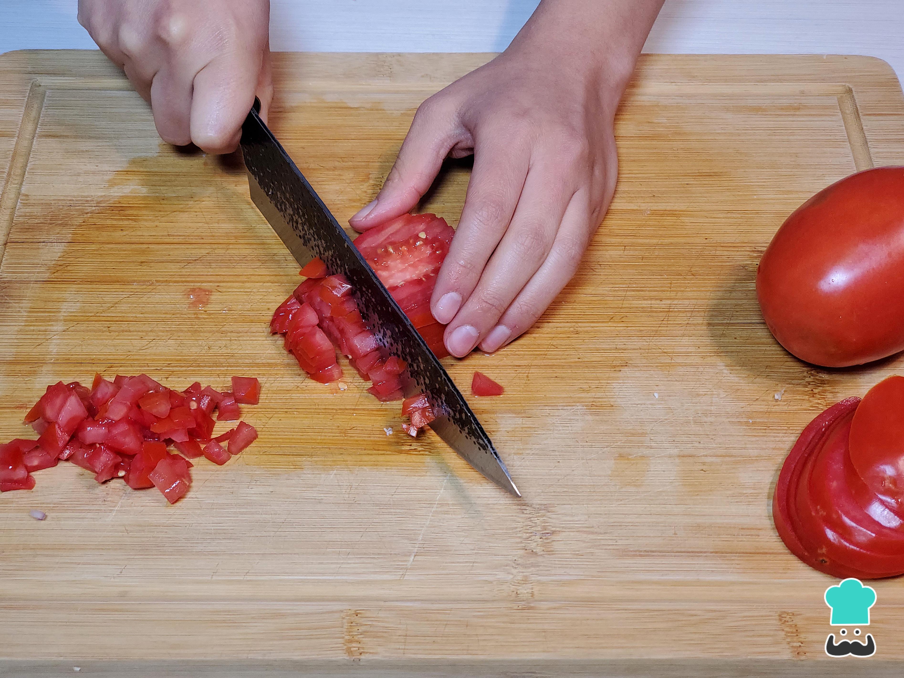 Para el tomate, corta en láminas delgadas y, luego, en tiras finas (juliana). Finalmente, corta las tiras en cubos pequeños del mismo tamaño que la cebolla.