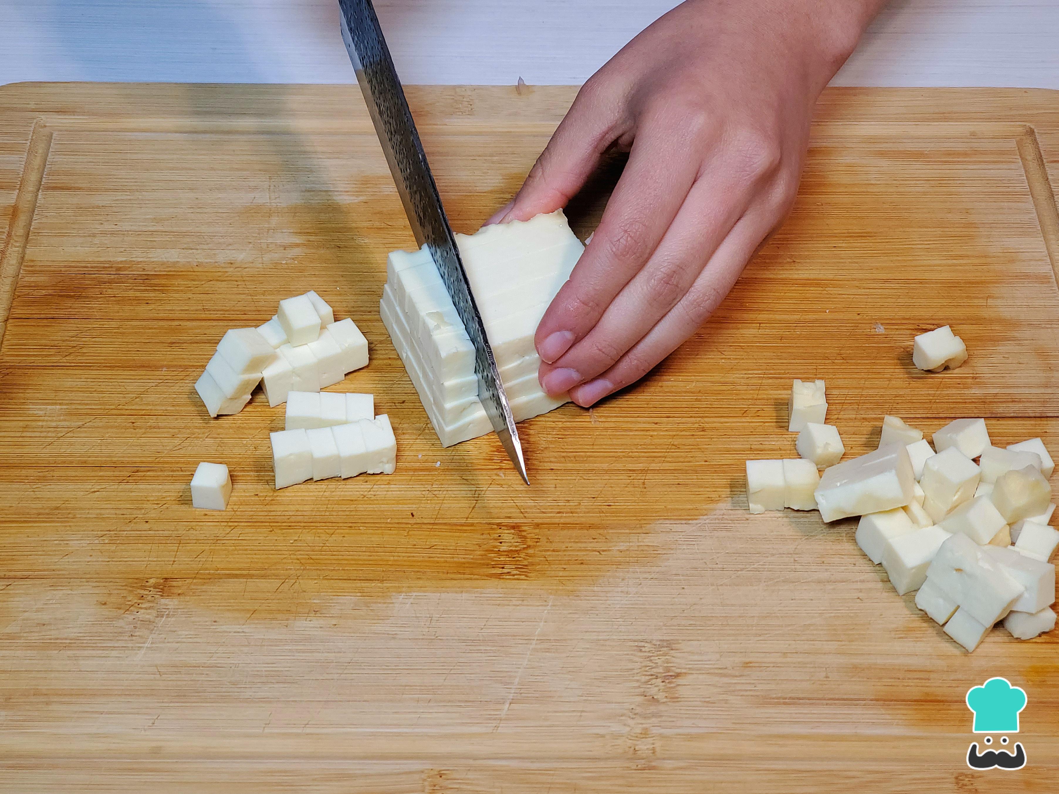 Procede de igual manera con el queso fresco, primero en láminas, luego en tiras y, finalmente, en cubos un poco más grandes que la cebolla y el tomate.