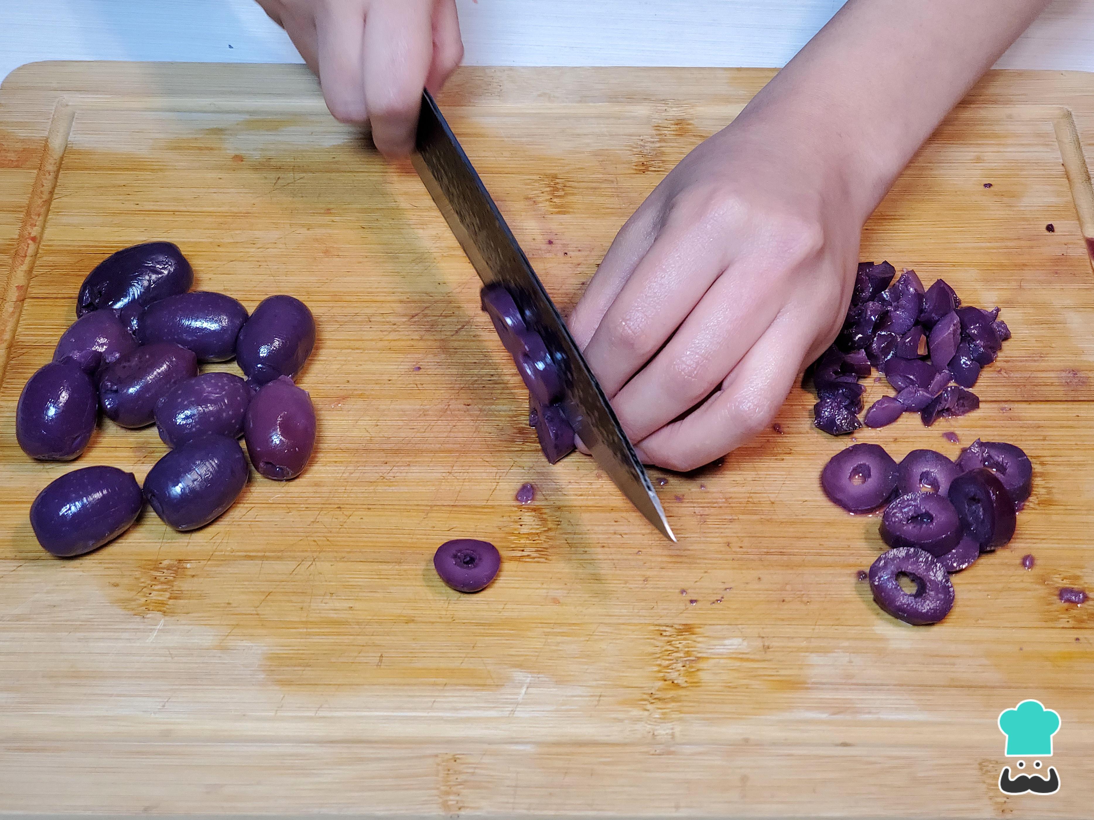 Para las aceitunas, asegúrate de despepitar y cortar algunas en rodajas para decorar. El resto, córtalas de forma rústica en tiras delgadas o en cuadrados para mantener un tamaño uniforme.