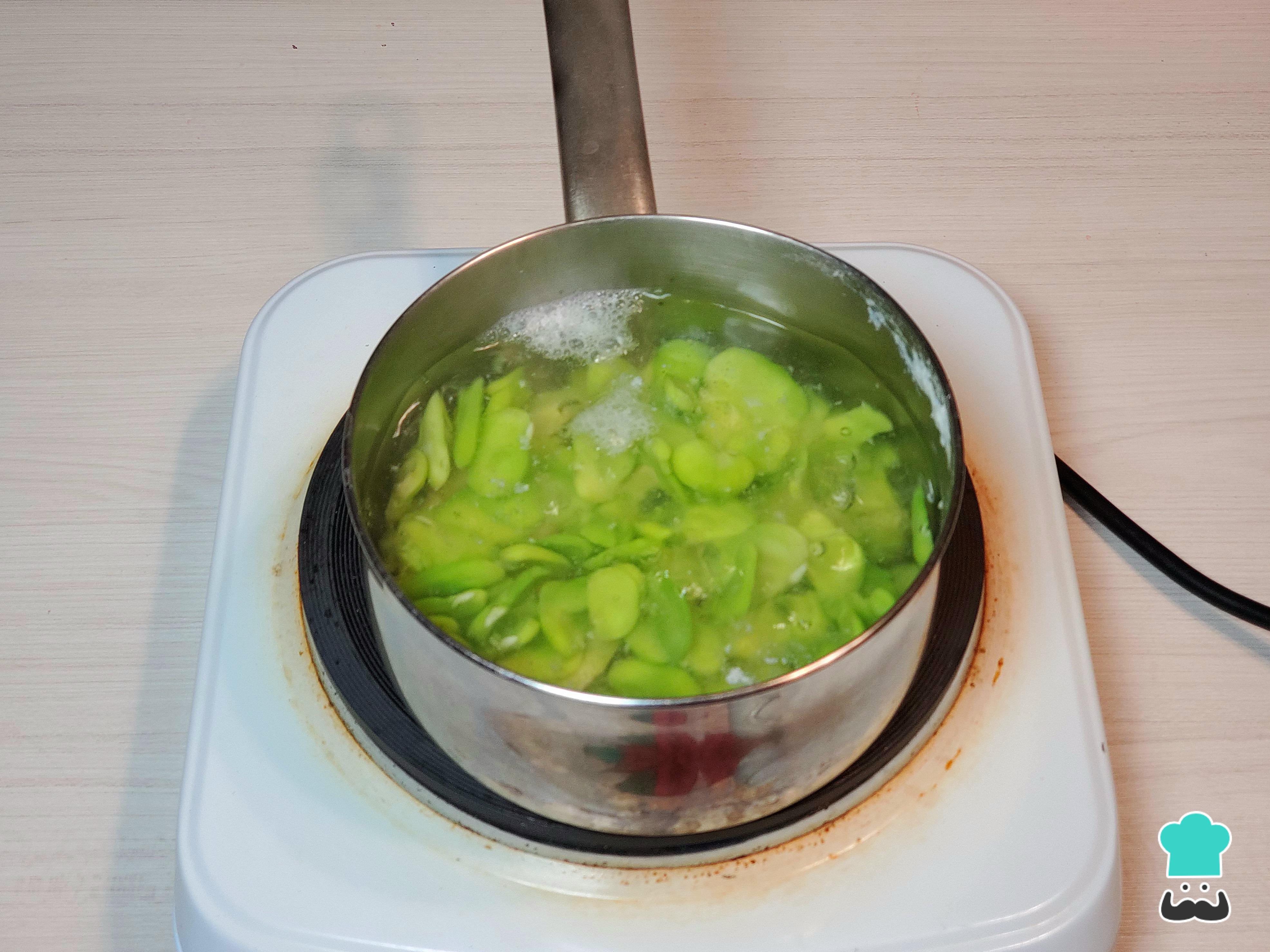 Para la estrella del plato, que son las habas, empieza pelándolas. Luego, blanquea sumergiéndolas en agua hirviendo con sal durante unos 2-3 minutos hasta que estén bien cocidas. Inmediatamente después, pásalas a un recipiente con agua helada para detener la cocción y mantener su color verde brillante.