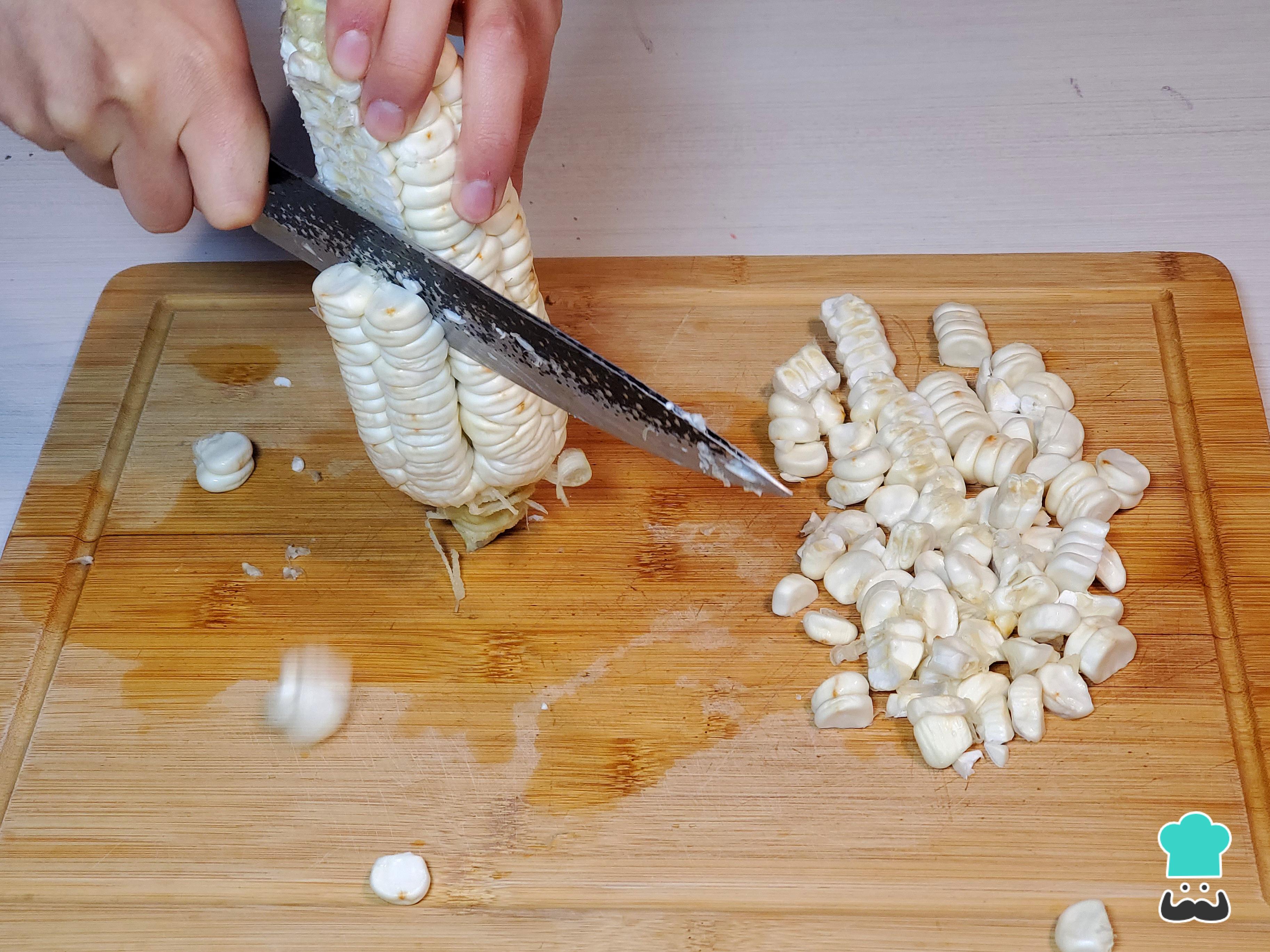 Finalmente, desgrana el choclo y blanquéalo en el agua salada en la que blanqueaste las habas. Deja que se cocinen por aproximadamente 4-5 minutos o hasta que los granos estén tiernos. Una vez cocidos, retíralos del agua y colócalos en un bowl junto al resto de los ingredientes.