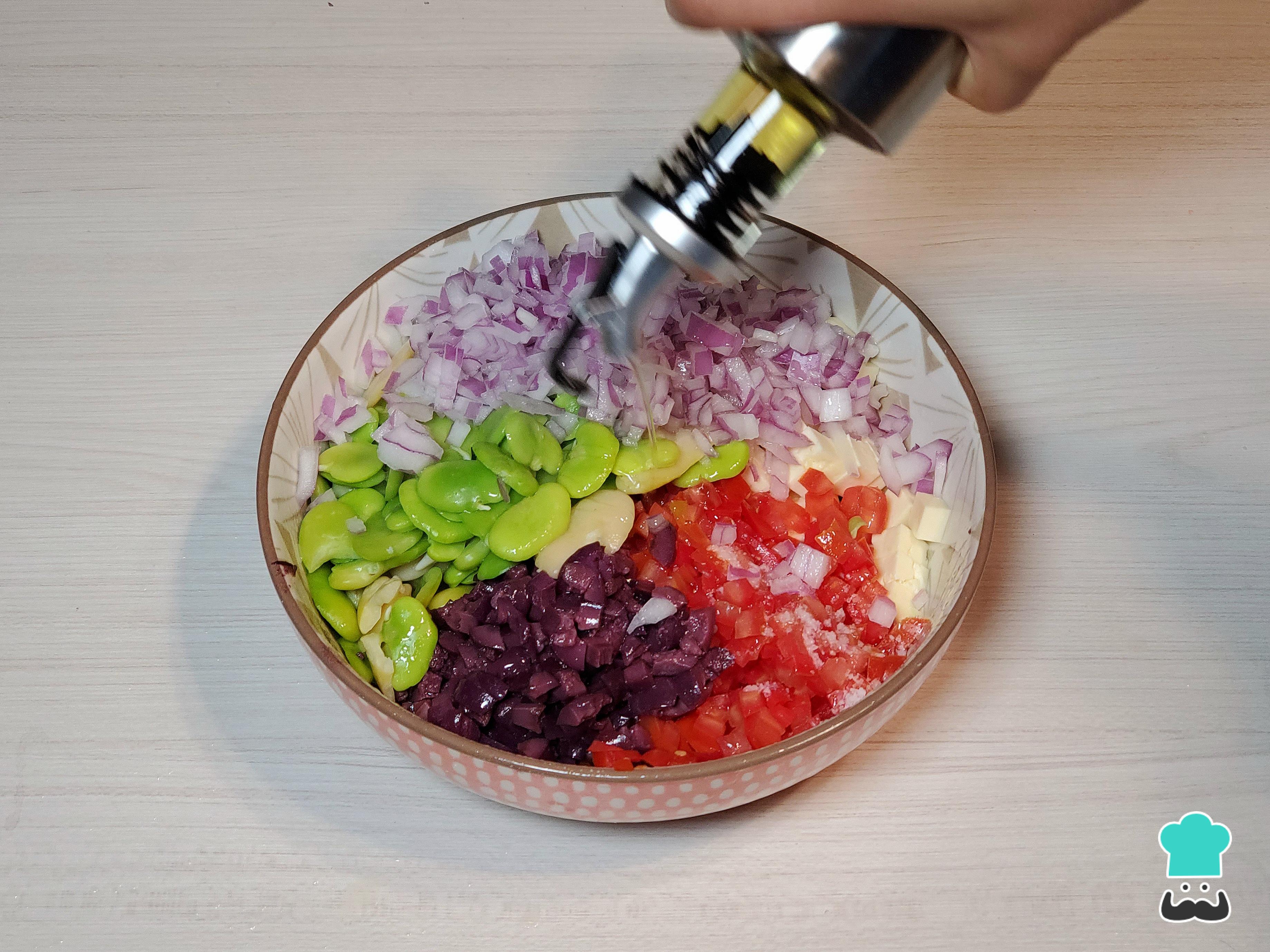 Para terminar, sazona con jugo de limón, vinagre, sal y aceite de oliva. Asegúrate de mezclar bien todos los ingredientes para que se integren y se impregnen del aderezo.