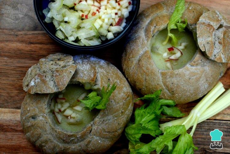 Vertemos la sopa de apio, cebolla y puerro dentro de los panes, cortamos la manzana y la ramita de apio que teníamos guardada en trocitos muy pequeños y ya podemos servir esta extraordinaria crema con el pan tostado.