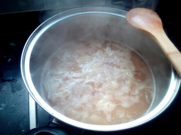 Mientras tanto, ponemos a hervir el caldo de carne y cuando lo haga, apagamos el fuego y lo reservamos para más tarde. Podemos utilizar otro tipo de caldo casero para hacer la sopa de cebolla casera como el de caldo de verduras o el caldo de pollo, pero el de carne le dará un sabor más fuerte a nuestra receta de sopa de cebolla.