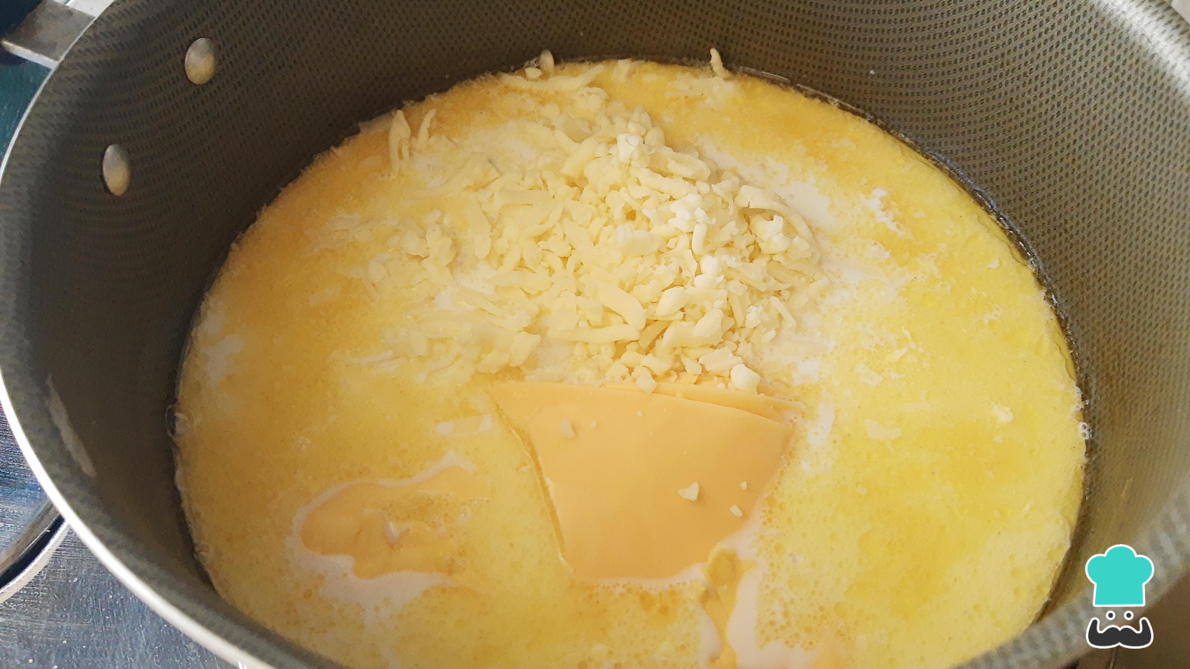 Agrega los quesos: el queso amarillo y el queso manchego rallados. Mezcla muy bien hasta que se integren y quede una salsa ligeramente espesa.