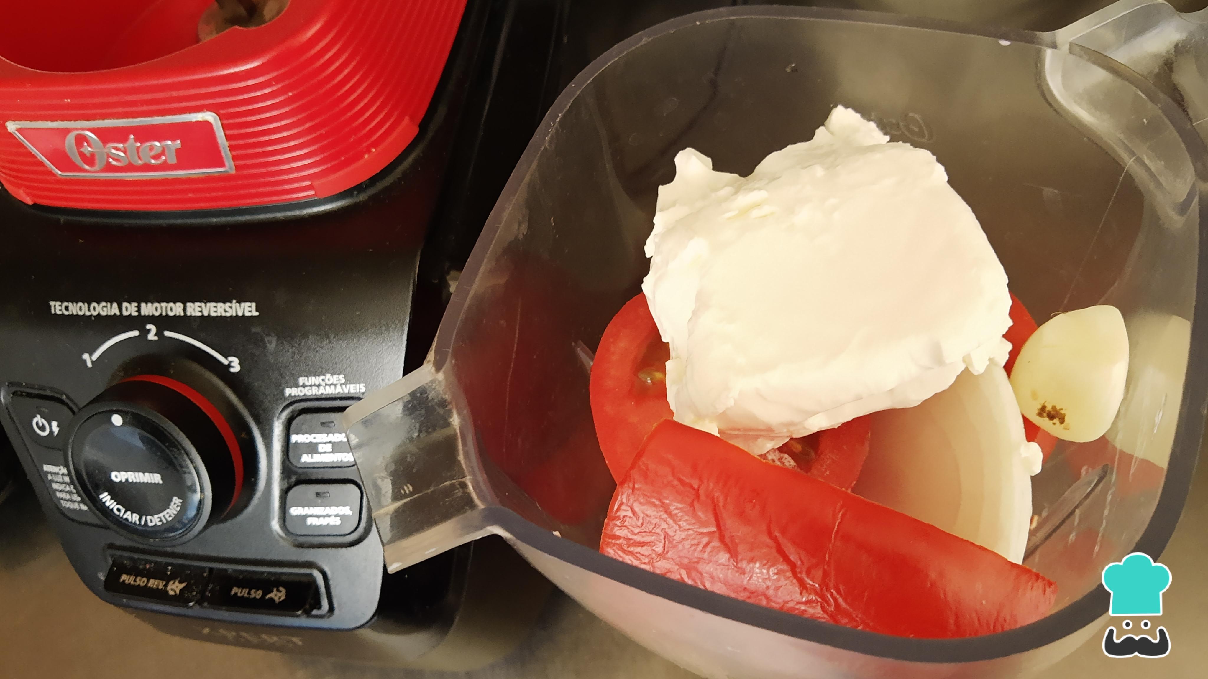Pasa a la licuadora con los tomates rojos, la cebolla, el queso crema y media taza de agua, licúa todo por 3 minutos y reserva.
