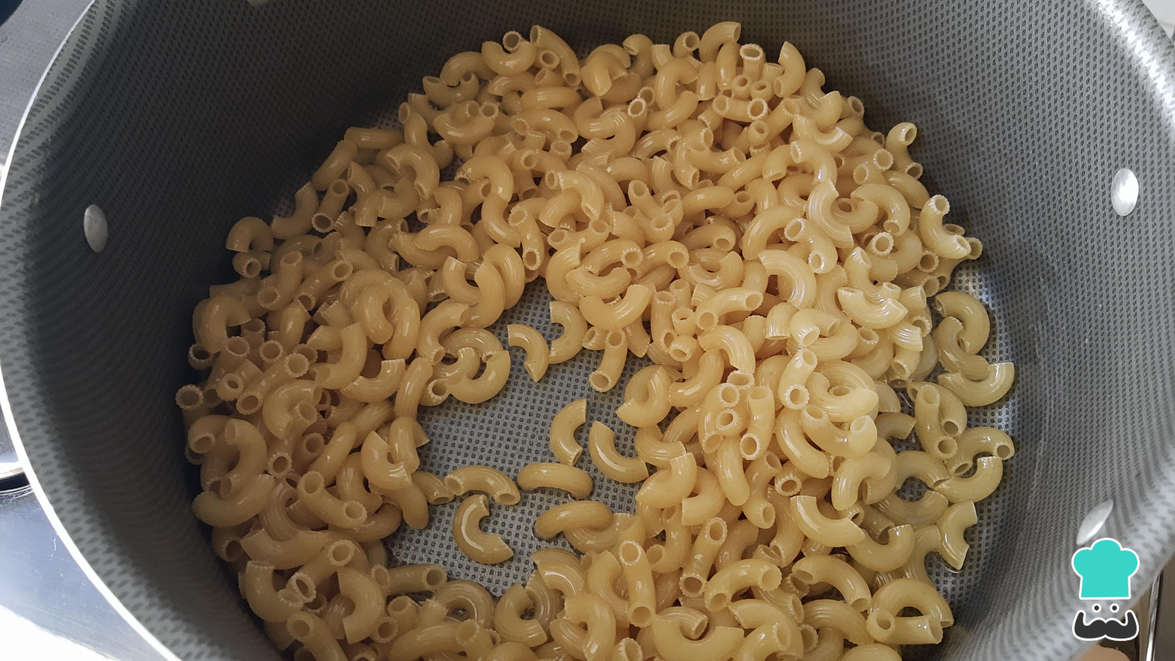 En una olla calienta 3 cucharadas de aceite y vacía la pasta de codito. A continuación, cocina hasta dorar moviendo continuamente para que no se queme, estará lista cuando haya cambiado su color a un tono ámbar dorado.