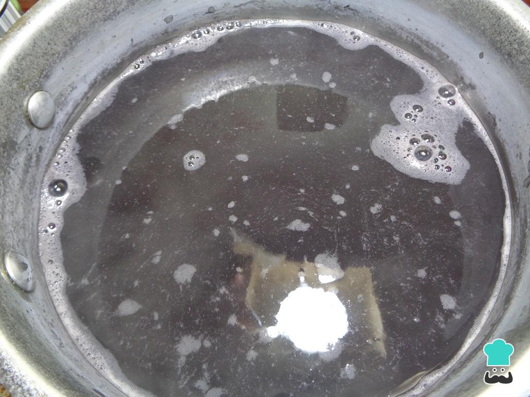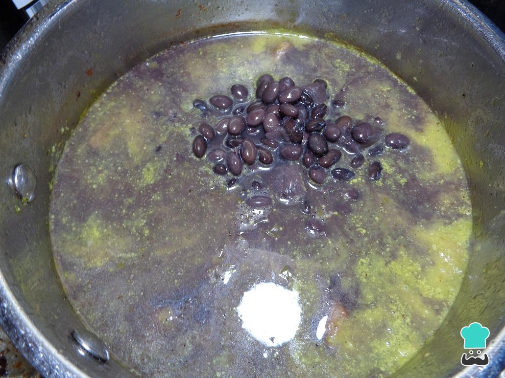 Para comenzar con esta preparación debemos cocer el frijol negro. Si tienes olla express queda perfecto ya que los frijoles se cocerán mas rápido; si no tienes te recomiendo que pongas a remojar los frijoles desde una noche antes o por lo menos 8 horas antes, ya que esto los ablanda y hace que su cocción sea mas rápida. Entonces colocamos los frijoles en una cacerola con suficiente agua, añadimos un diente de ajo y la mitad de la cebolla, y dejamos que se cocinen hasta que se sientan muy suaves.