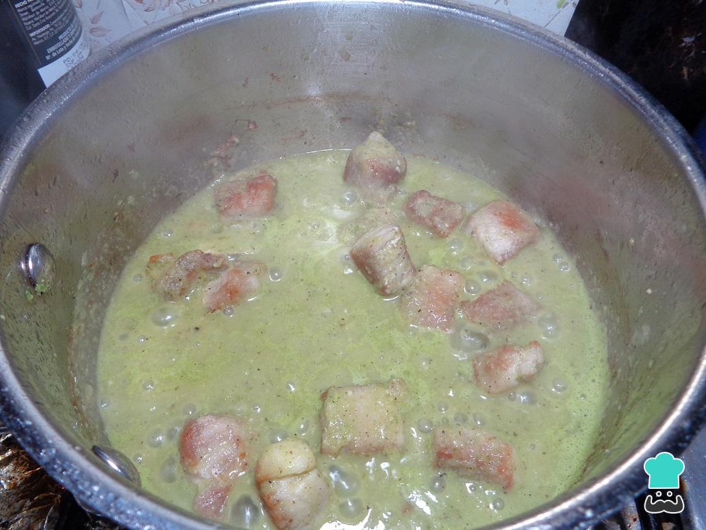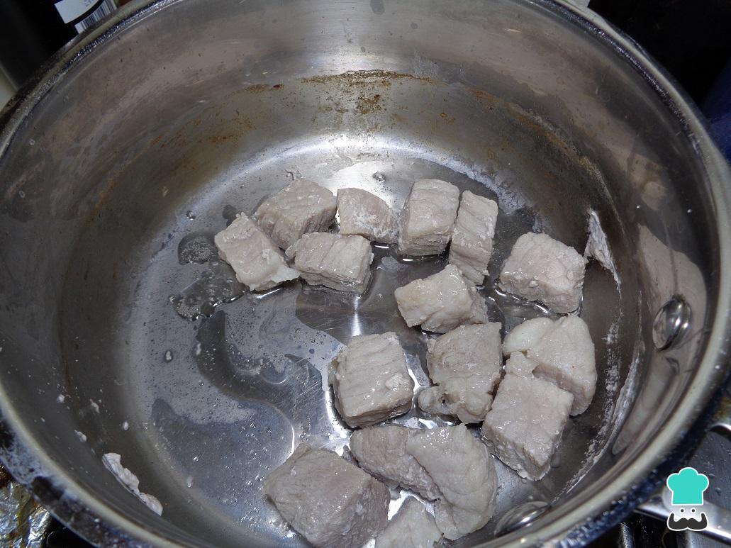 Por otra parte tomamos los trozos de carne de cerdo y los llevamos a freír en una cacerola con aceite previamente calentado, dejamos que se frían hasta que estén completamente cocidos.