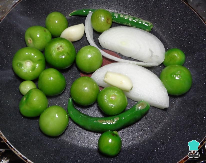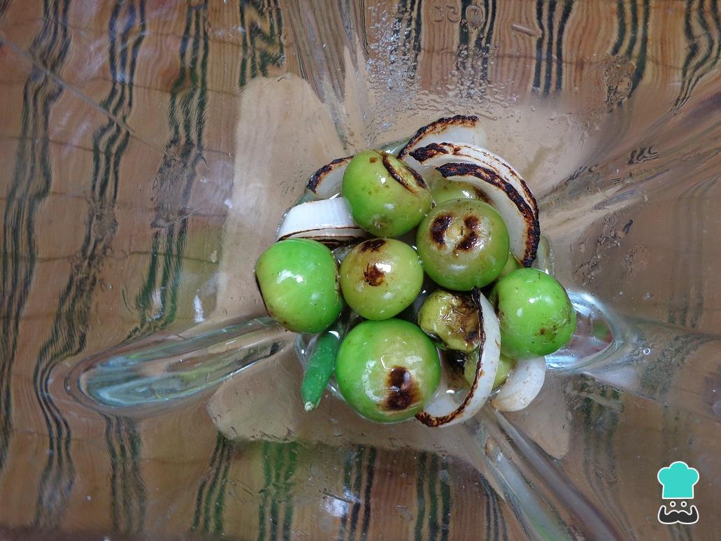 Mientras tanto en un la plancha caliente vamos a colocar los tomates verdes junto con los chiles serranos, la mitad sobrante de cebolla y los ajo para que se asen muy bien.