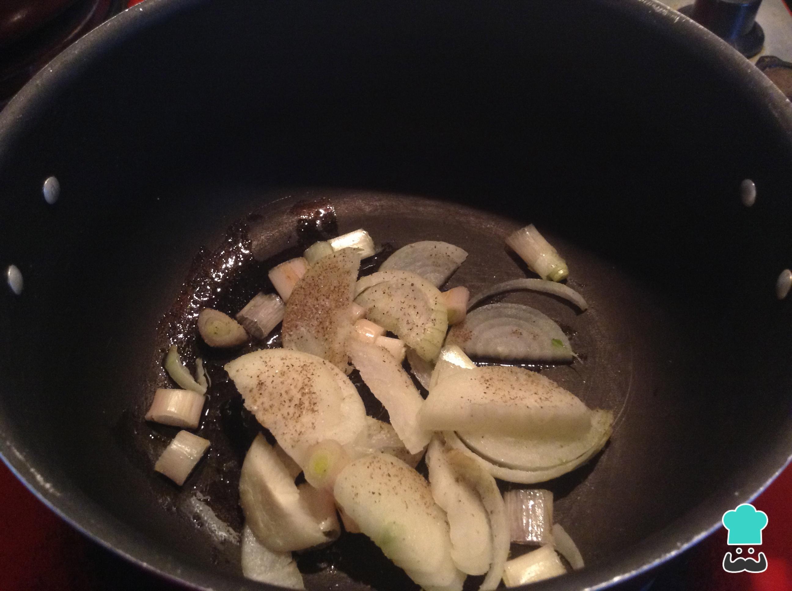 Debes llevar una olla honda a fuego medio con una cucharadita de aceite de girasol, una vez caliente adiciona las cebollas blanca y larga con sal y pimienta al gusto. Deja sofreír durante algunos minutos.