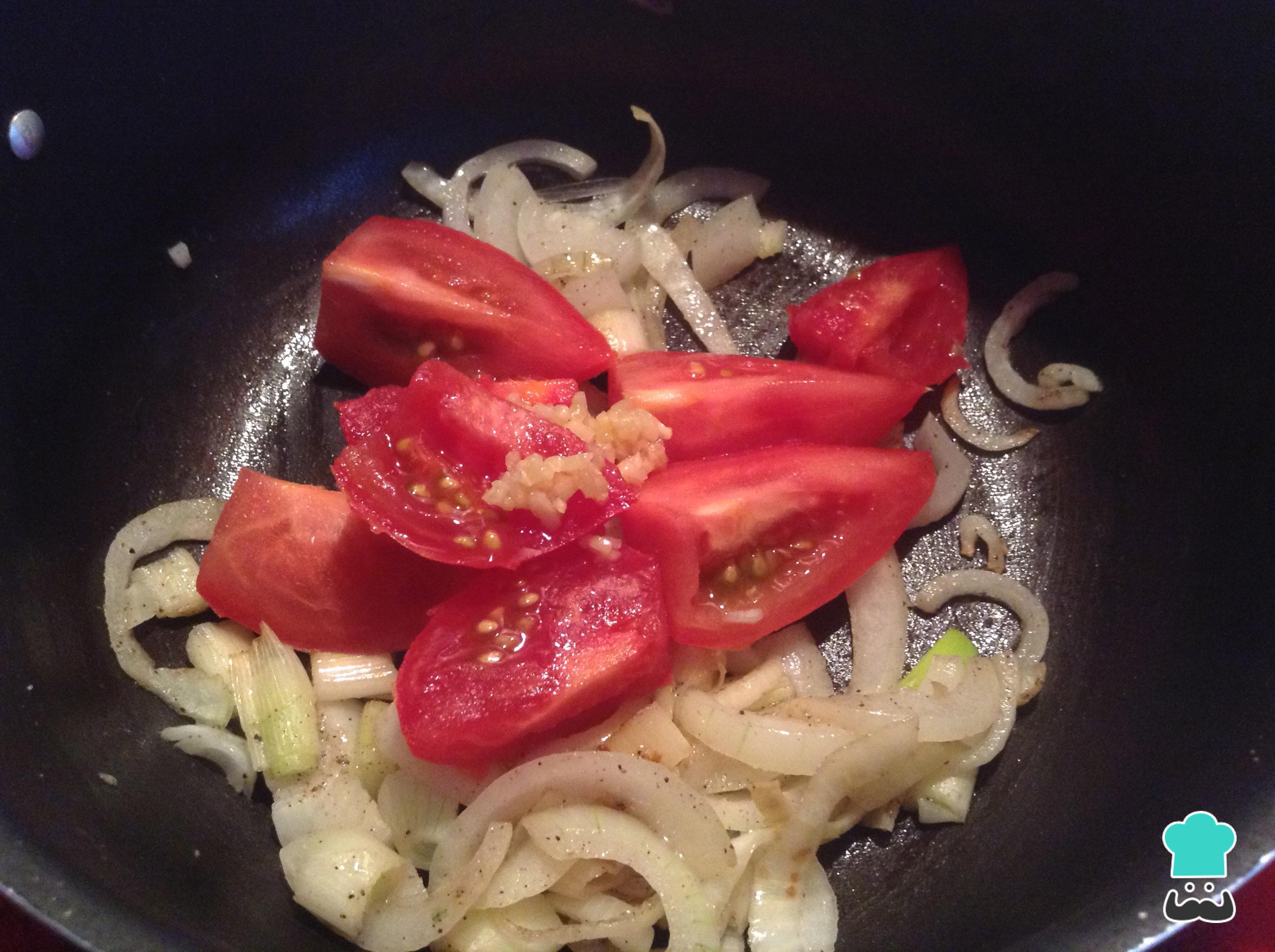 Una vez las cebollas tomen un tono transparente, agrega el tomate en cascos un poco de ajo en pasta y deja sofreír durante algunos minutos.