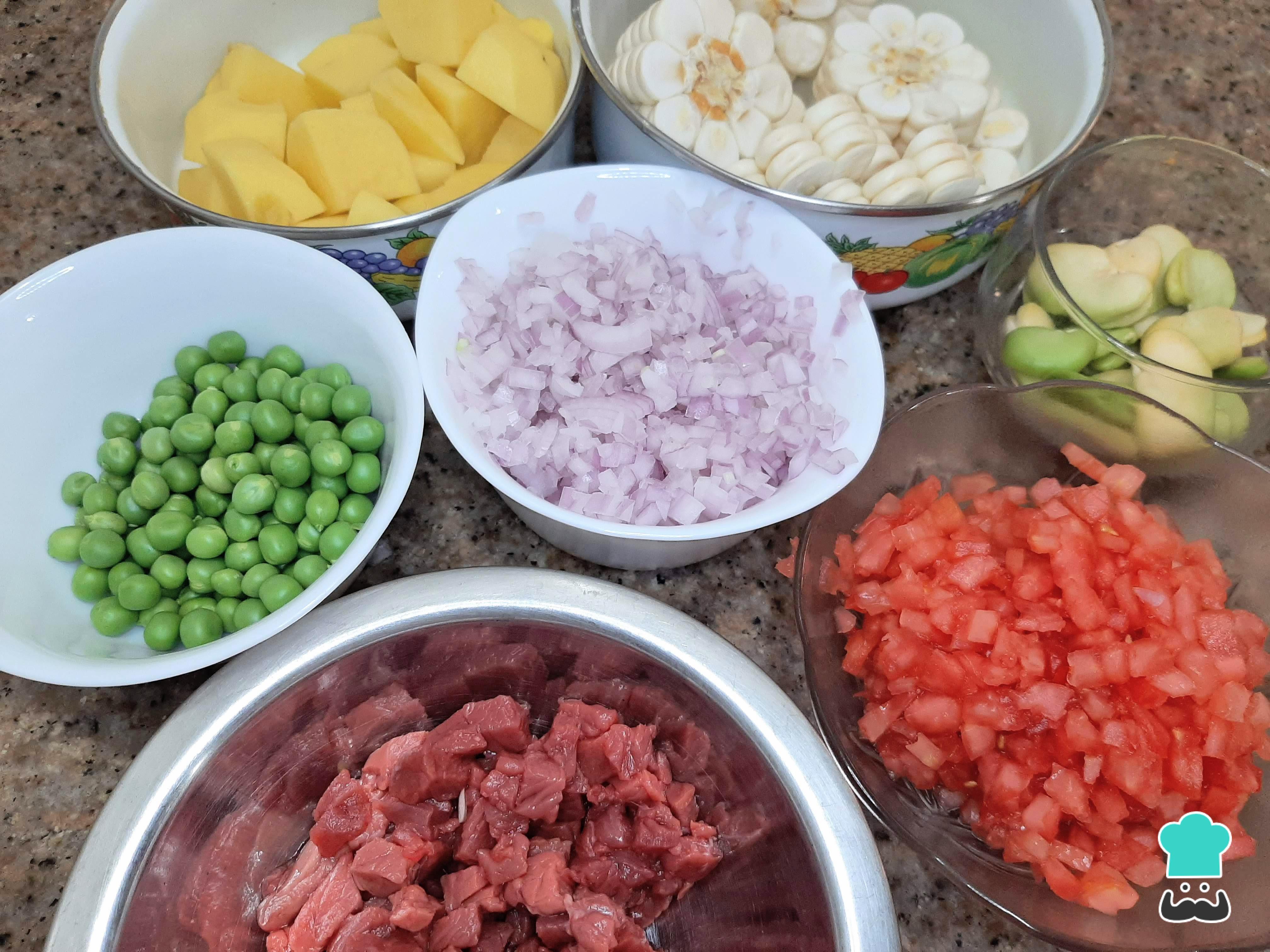 Para empezar con la receta de sopa de leche con carne, es importante tener todos los ingredientes cortados y separados en recipientes. En el caso de la carne en cuadrados pequeños, al igual que la cebolla. El tomate debe estar pelado y sin semillas, cortado en cuadrados muy pequeños. Las papas en pedazos grandes y las habas peladas.