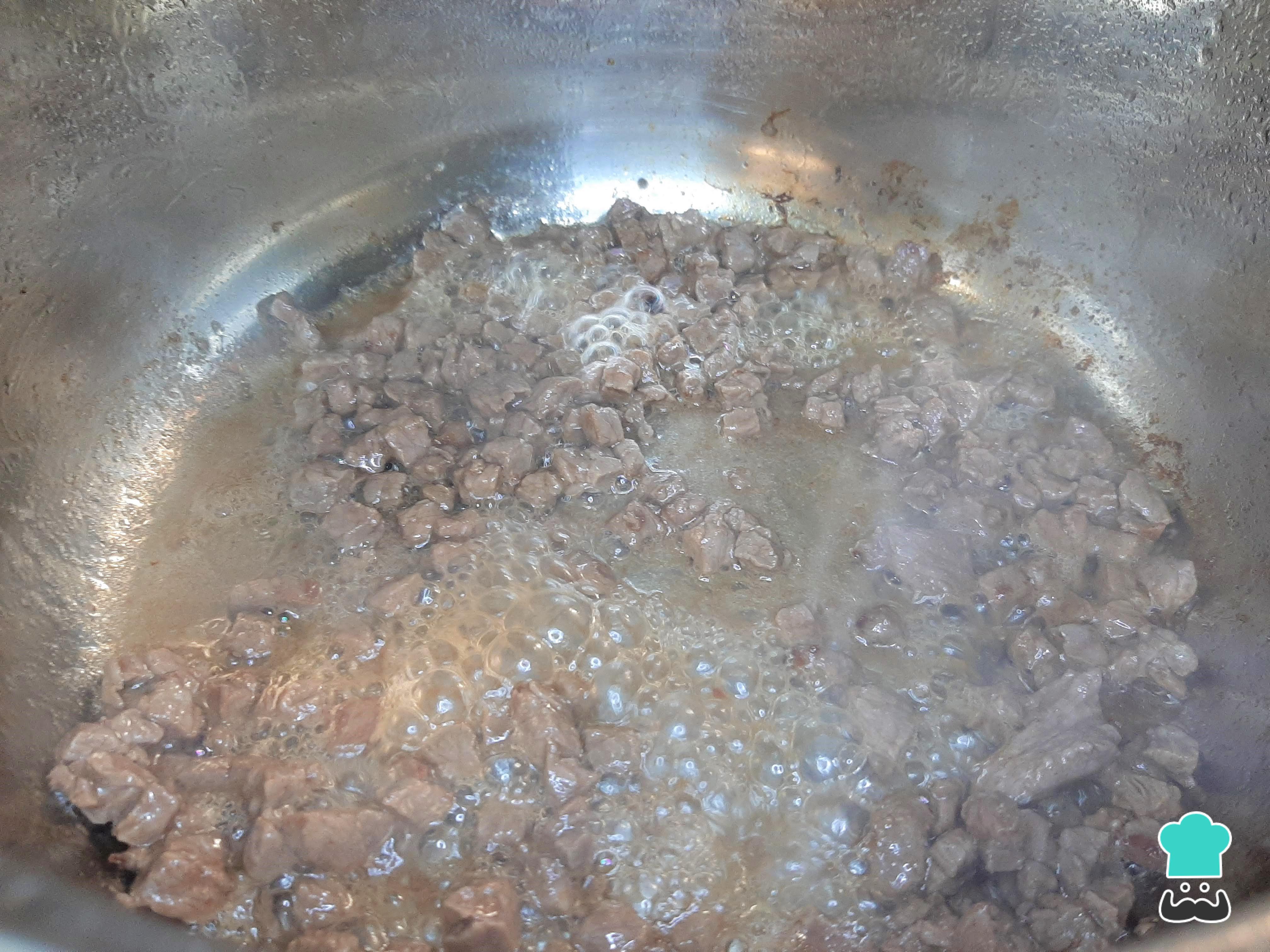 En una olla mediana agrega un chorro de aceite vegetal y cuando se encuentre caliente, añade la carne y sella por 5 minutos. Pasado el tiempo, retira con cuidado.