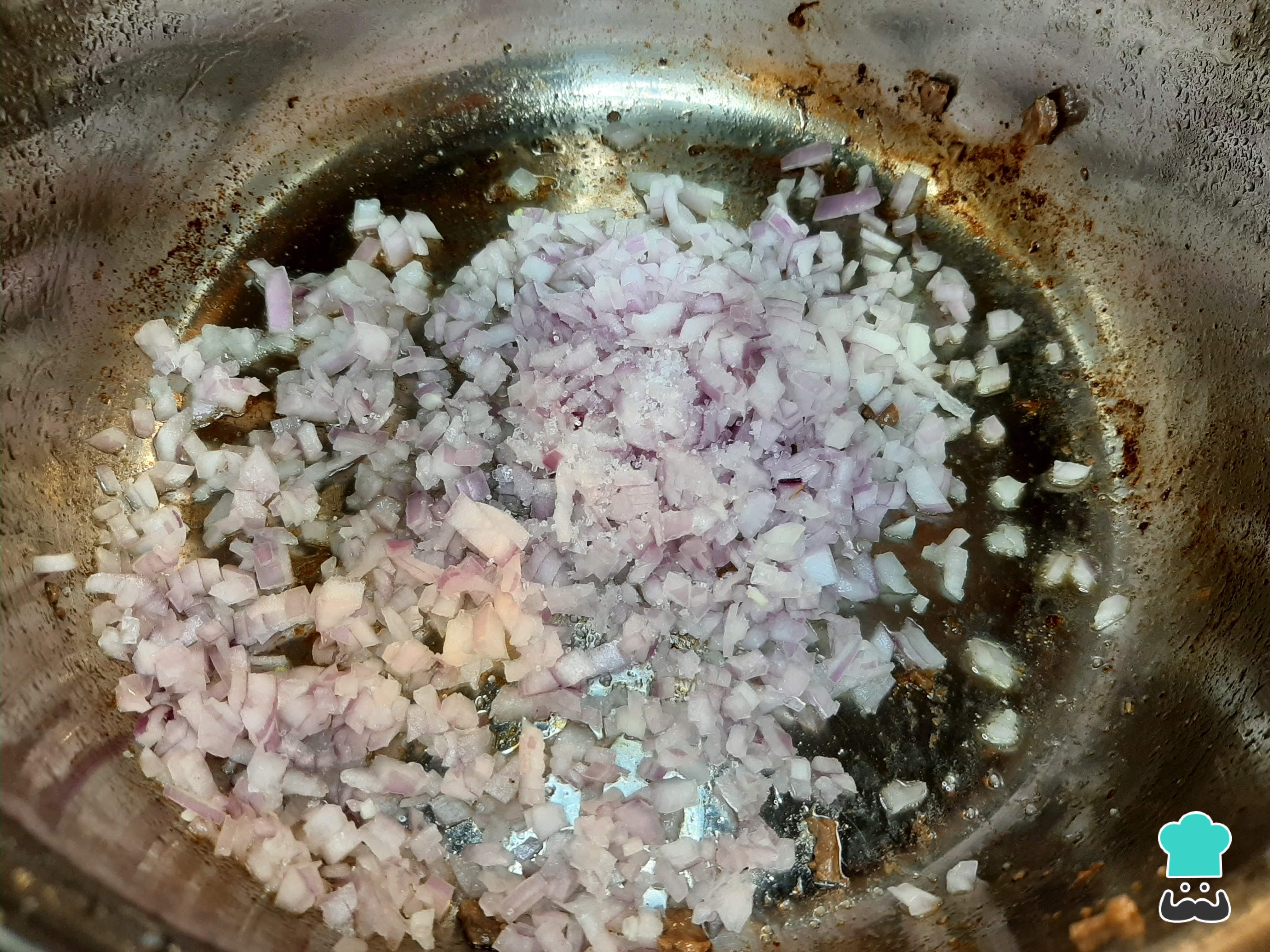 En la misma olla agrega la cebolla previamente picada y cocina aproximadamente 5 minutos, hasta que encuentre transparente. Seguido, añade 1 cucharada de pasta de ajo.