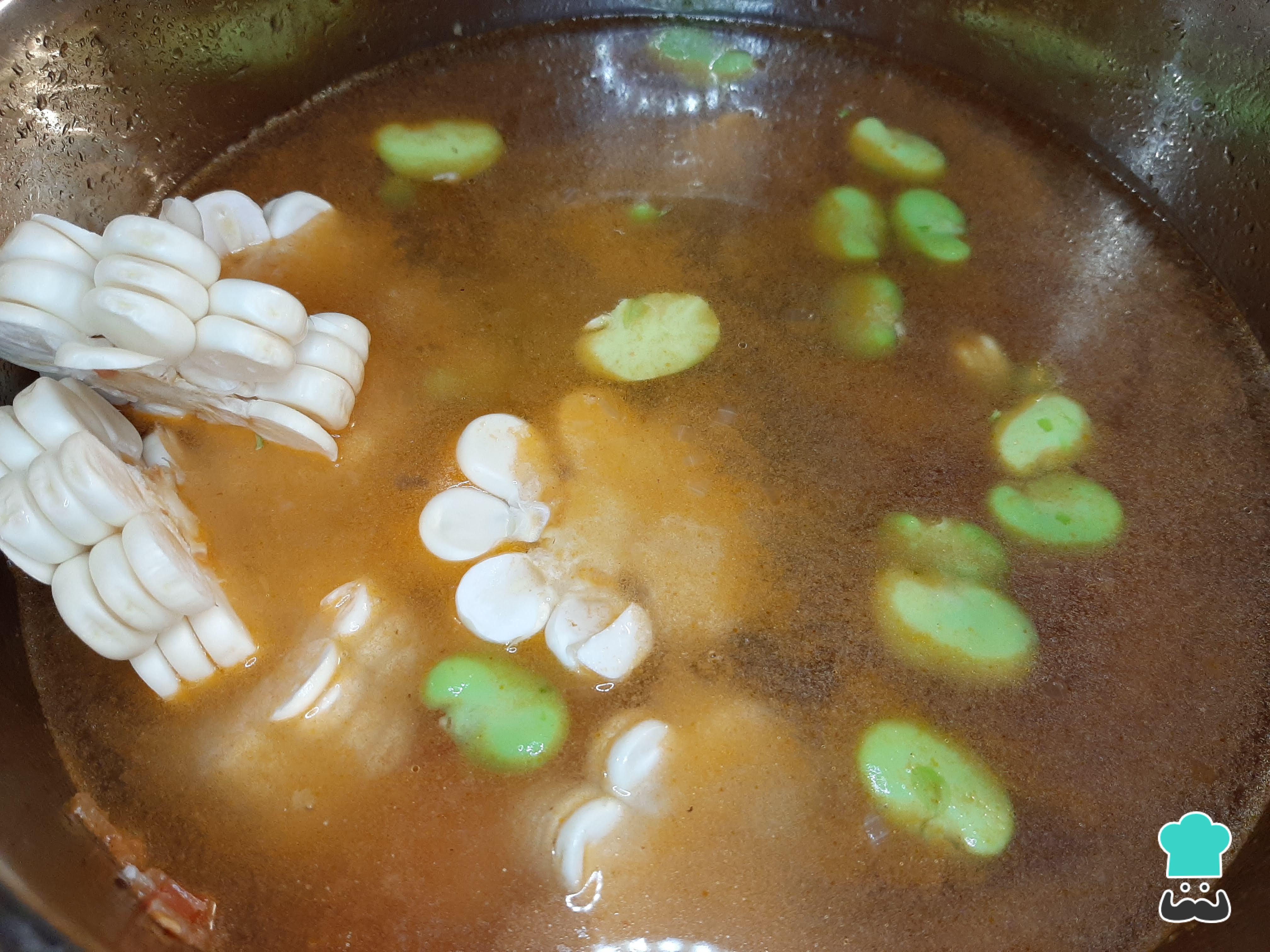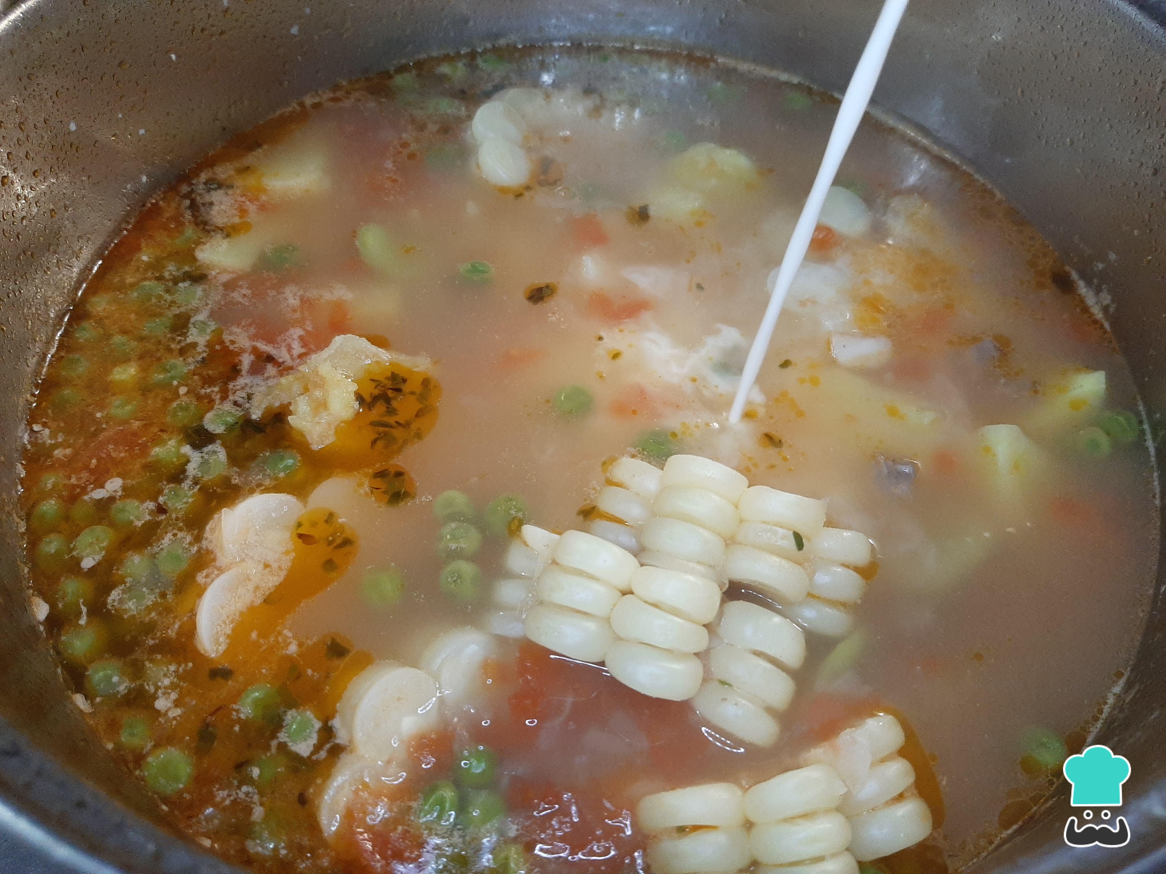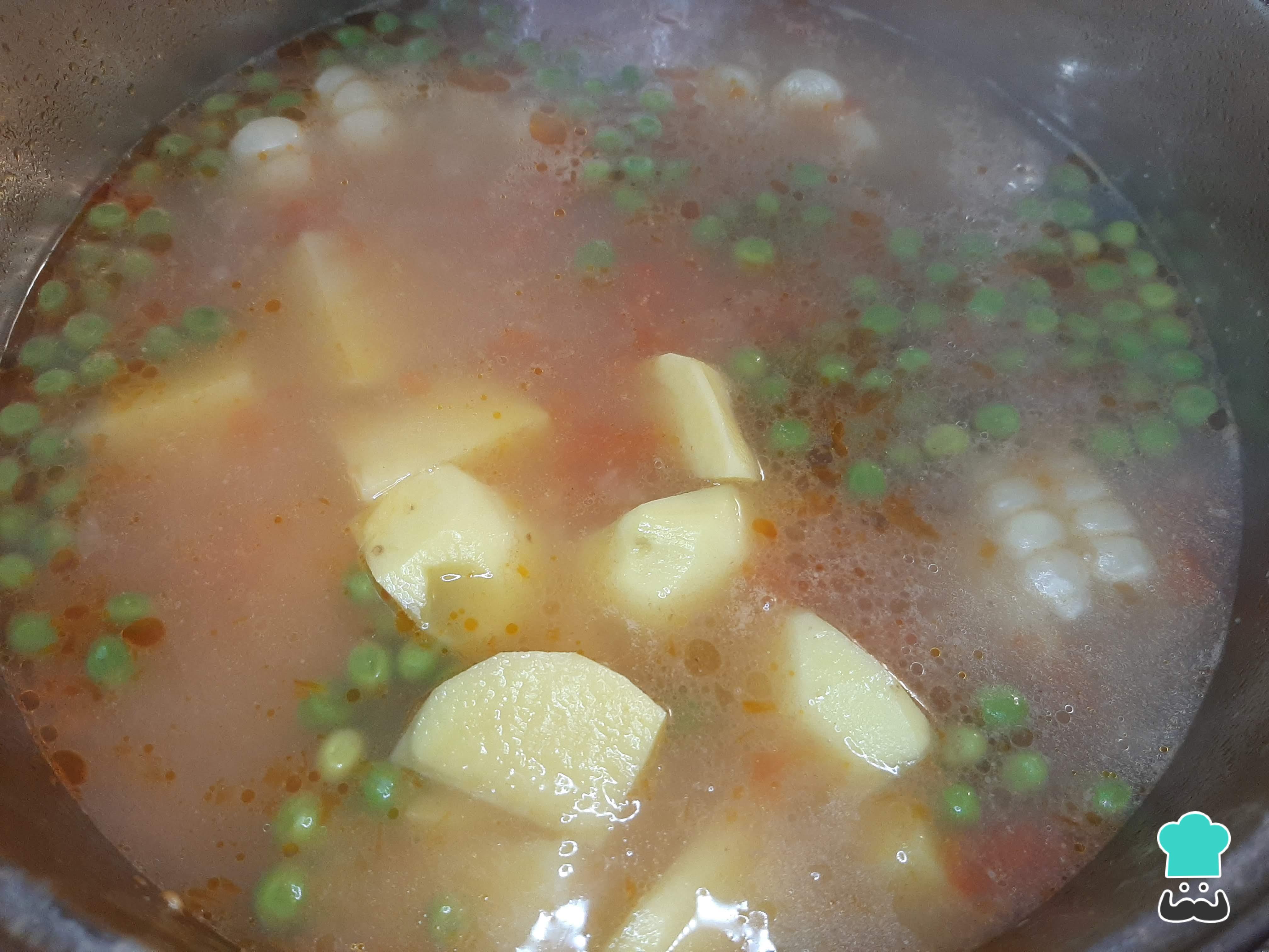 Añade 1 litro y medio de agua o fondo de res y agrega las verduras.