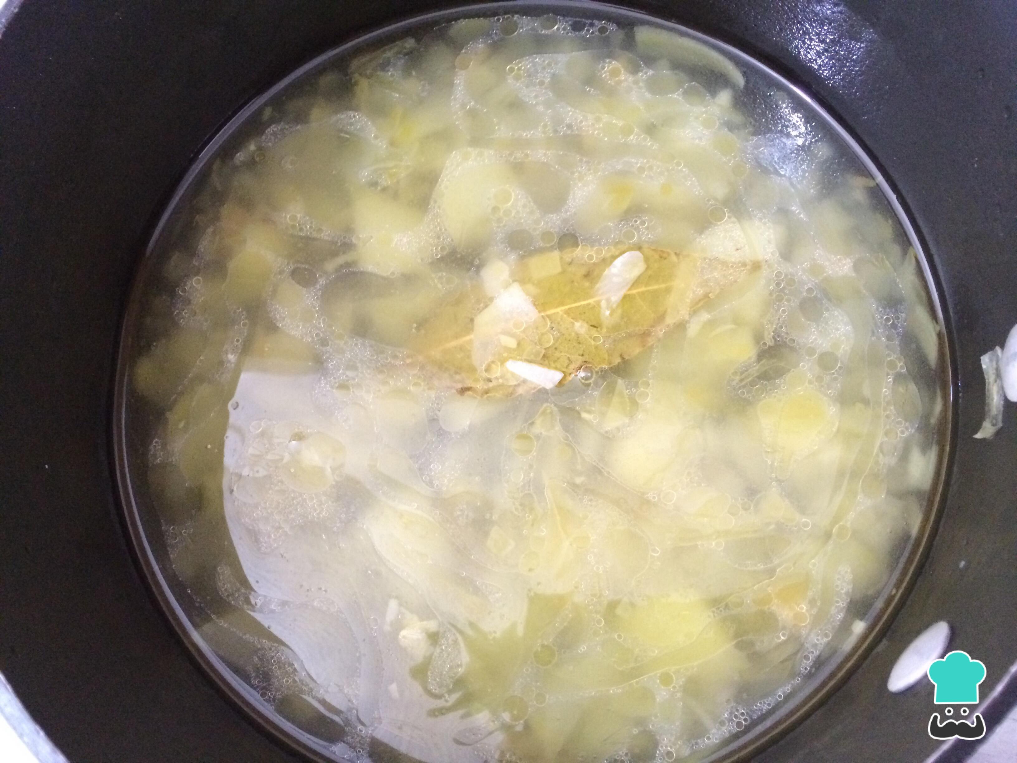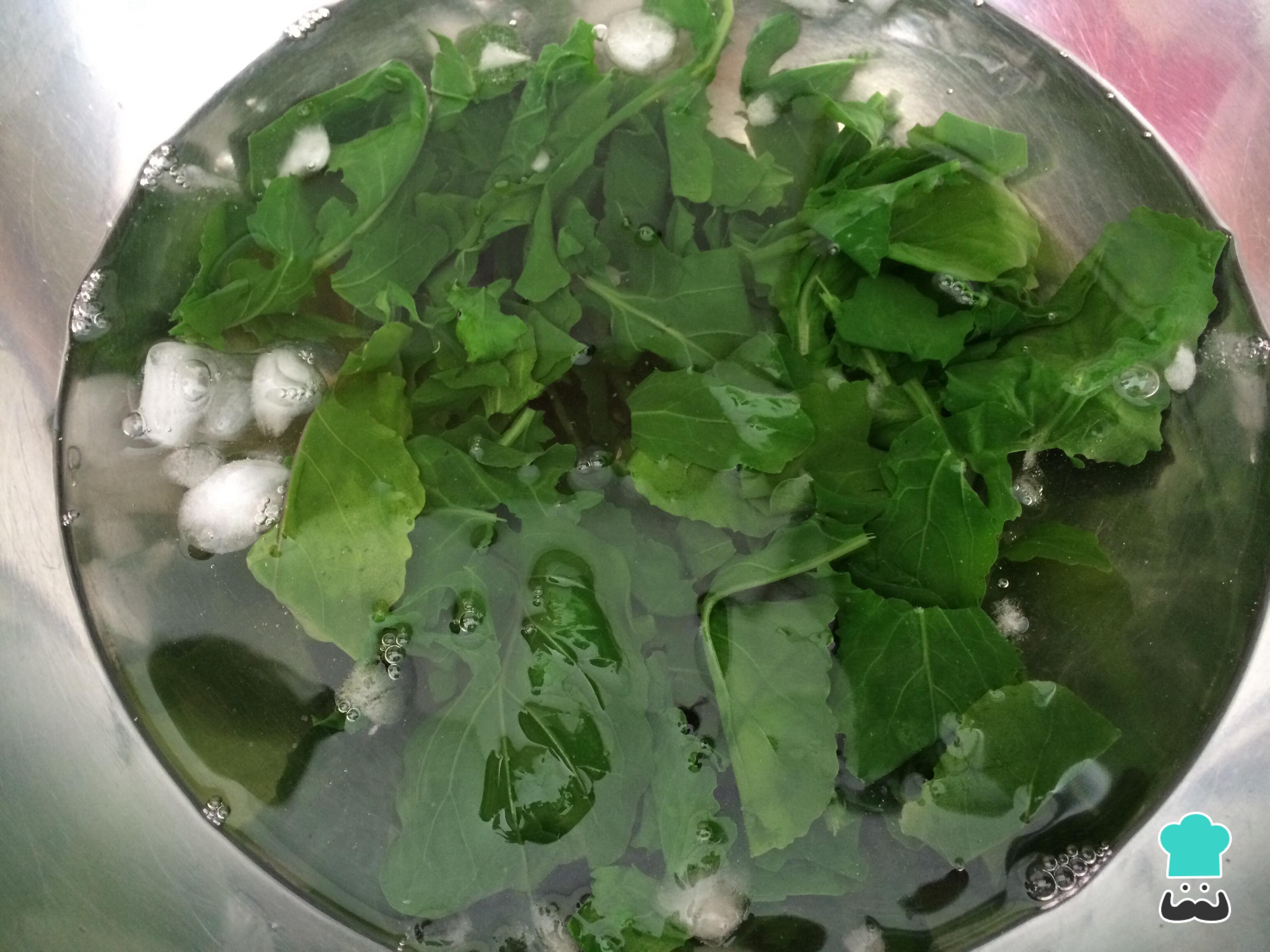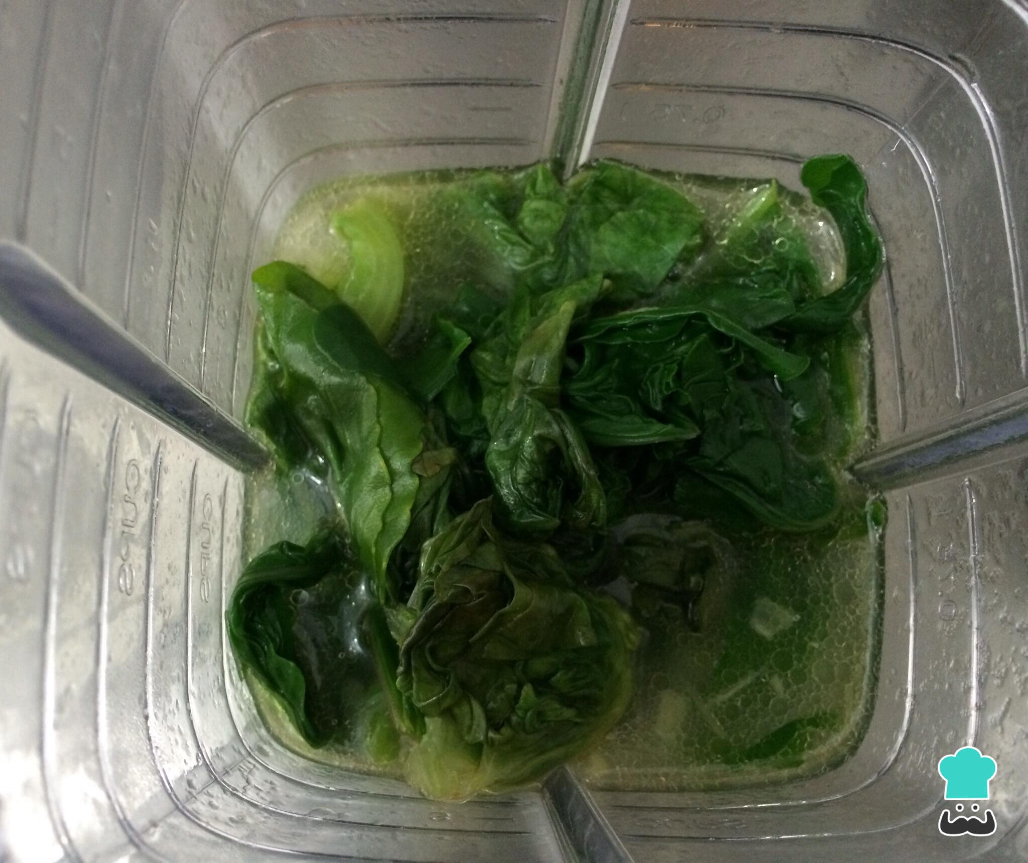En una olla con agua hirviendo y sal, agregar las hojas de lechuga y cocinar durante 2 minutos. Es importante respetar el tiempo, ya que sino pierden el color necesario para la sopa.