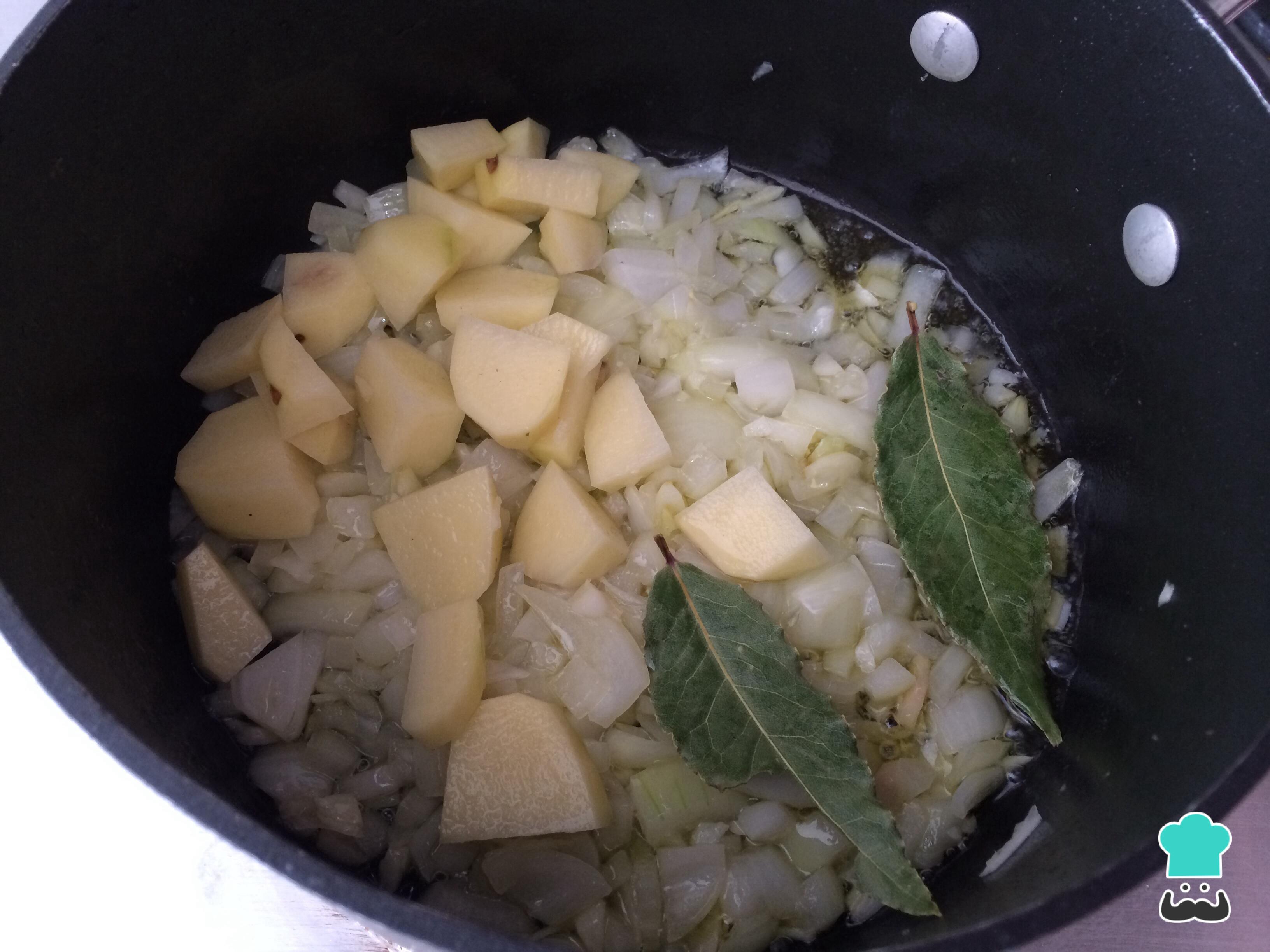 Aparte, para seguir con la preparación de la sopa de lechuga, en una olla con aceite de oliva sofreír la cebolla, el ajo y el jengibre cortados en cubos pequeños. Cuando esté translúcida la cebolla, añadir la patata y las hojas de laurel, mezclar muy bien.