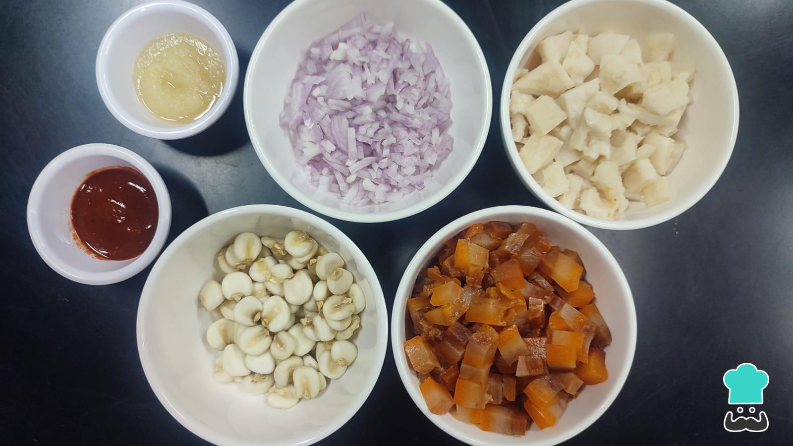 Empieza picando en cubos pequeños la pata de res y el mondongo. Ten separado el ajo molido y el ají panca molido. Además, ten la cebolla roja picadita para el aderezo. De preferencia, remoja previamente el maíz mote en agua aproximadamente 2 o 3 horas. Esto hará que el grano cocine más rápido.