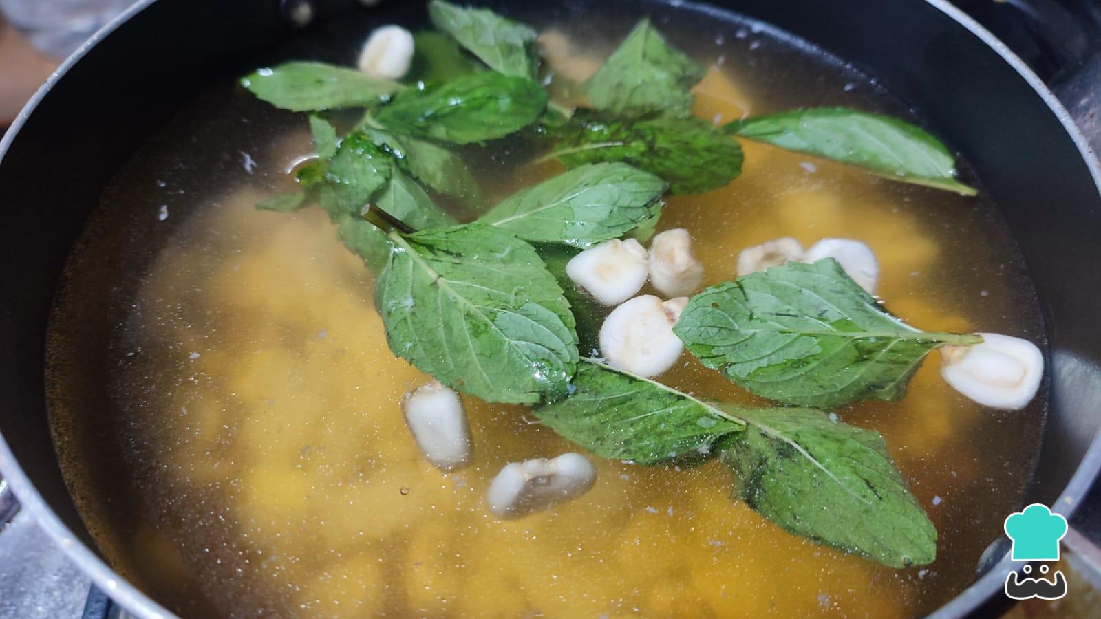 Pon en una olla a cocinar la pata de res, el mondongo y el maíz mote previamente remojado junto con una ramita de hierbabuena. Agrega también una pizca de sal.