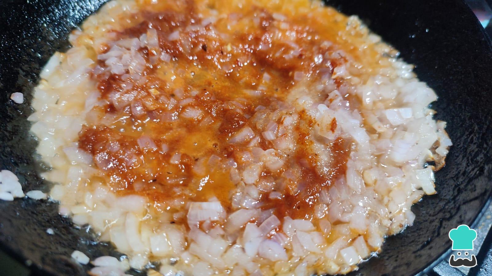 Por otro lado, calienta el chorro de aceite y agrega la cebolla roja, cocina por 2 minutos. Luego añade el ajo molido y el ají panca molido y sofríe por unos 5 minutos más. Si este aderezo se seca, puedes agregar un poco del caldo de cocción de las carnes.
