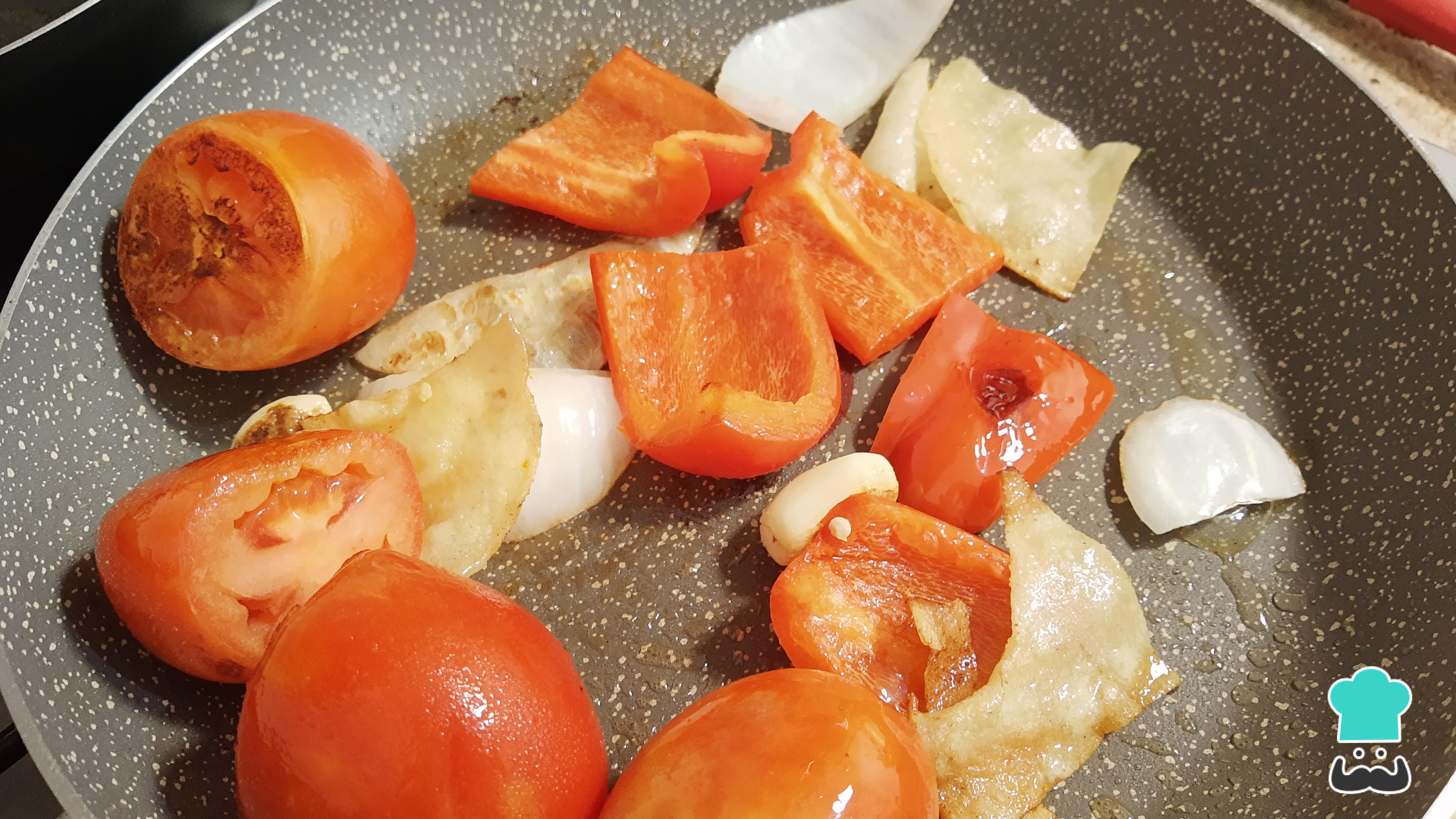 En una sartén calienta un poco de aceite vegetal y añade el trozo de cebolla, los dientes de ajo, el pimiento rojo, los jitomates y una tortillas cortada, fríe todos estos ingredientes hasta que estén completamente dorados. Mueve constantemente para evitar que se queme cualquiera de los ingredientes.