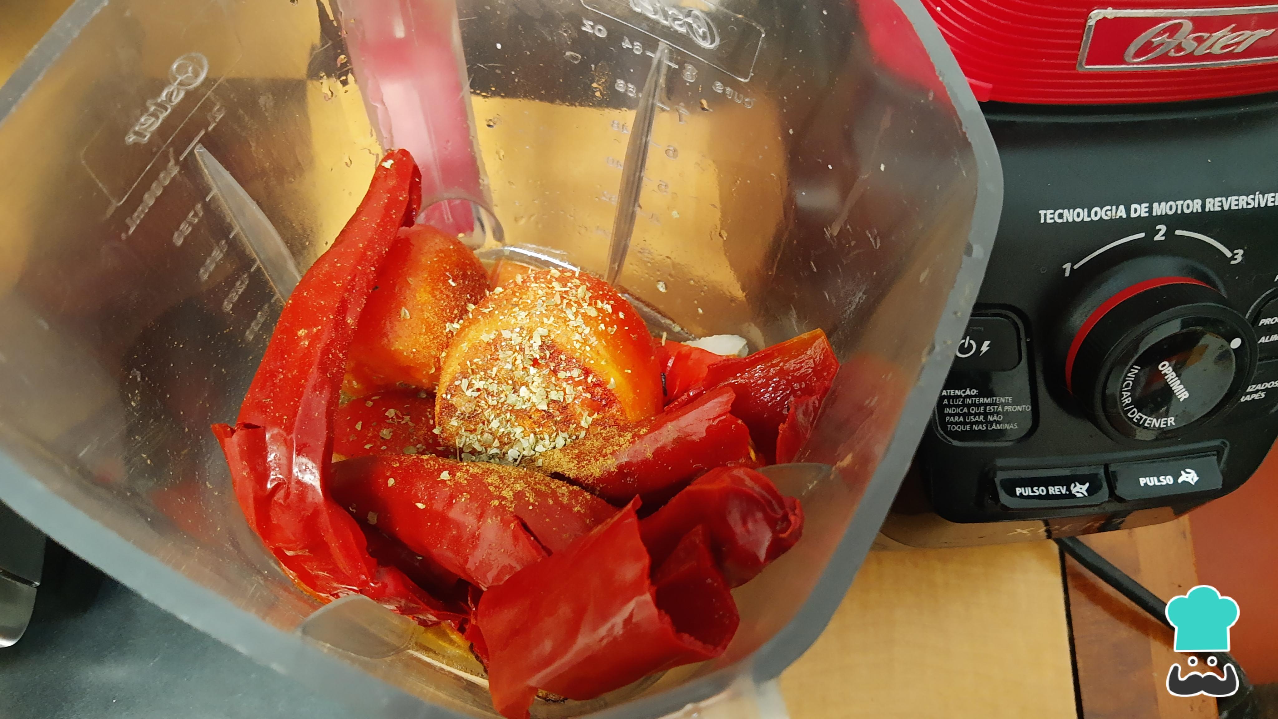 Cuando esté bien dorado la cebolla, los dientes de ajo, los jitomates, el pimiento y la tortilla, licua agregando los chiles guajillo suavizados y una y media taza de agua. También agrega la pizca de comino y la pizca de orégano, licua todo por unos 3 minutos.