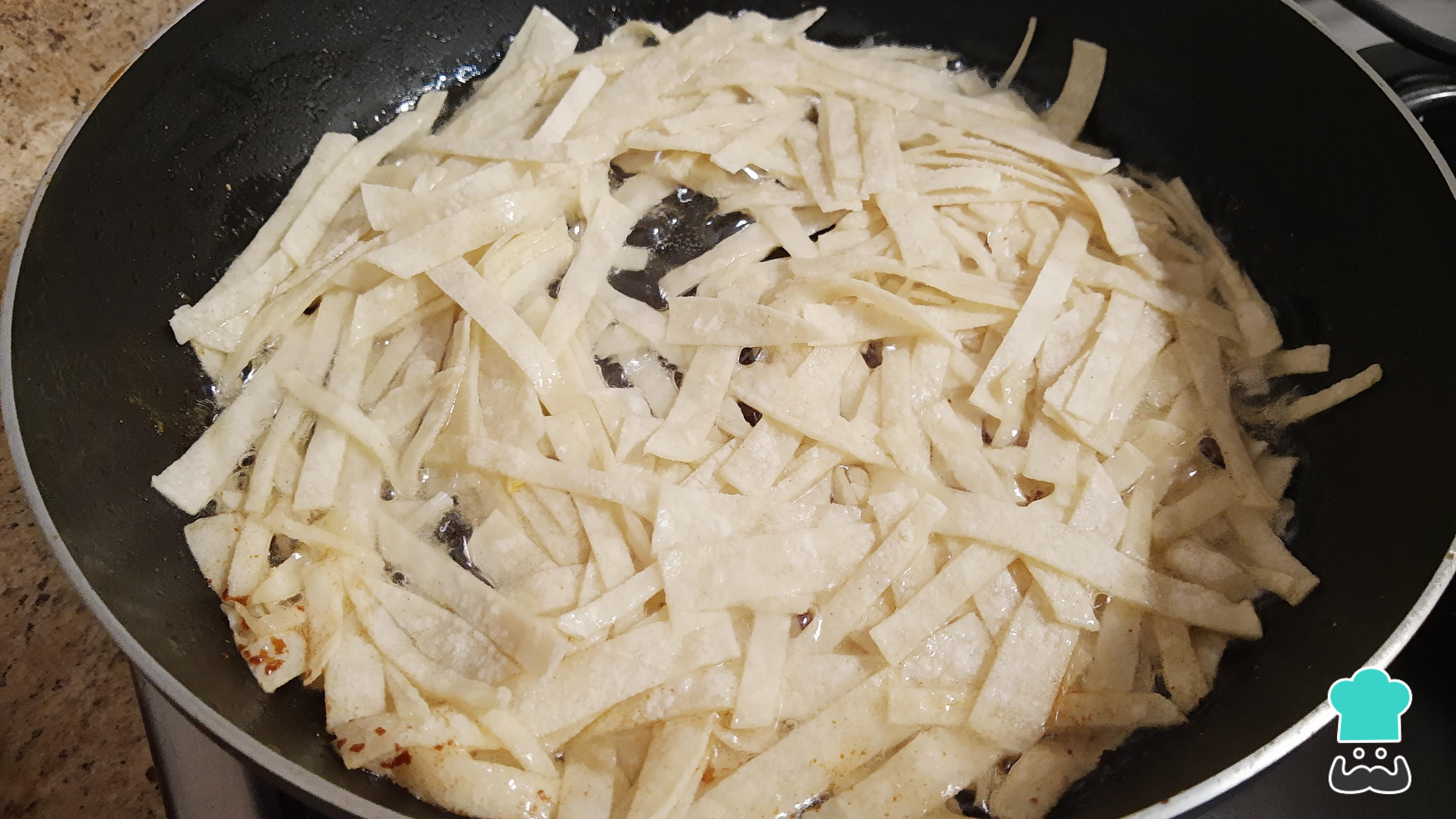 Para la presentación de la sopa, corta en tiras pequeñas las tortillas y lleva a freir en aceite hasta que se doren y estén crujientes. Haz este mismo paso con el chile guajillo y, cuando estén perfectamente dorados, retira el excedente de aceite con una servilleta o papel absorbente y reserva.