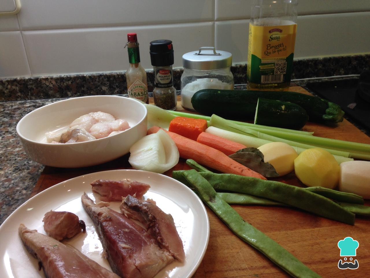 Veamos los ingredientes para esta sopa de verduras. Lo bueno de este tipo de recetas es que las puedes hacer con los ingredientes que tengas en ese momento en casa. Puedes variar las verduras, eliminar alguna, sustituir otra, cambiar las cantidades... Puedes hacer esta sopa con pescado, también, con varias especies, pero te recomendamos que elijas piezas sabrosas y sin espinas. El bonito nos lo han limpiado bien en la pescadería, y el rape solo cuenta con la espina central.
