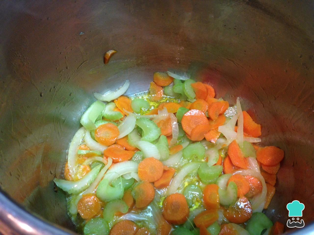 Empezamos haciendo un sofrito con las verduras. En una olla grande verteremos un poco de aceite y, cuando esté caliente, añadiremos la zanahoria, la cebolla y el apio, todo bien troceado.