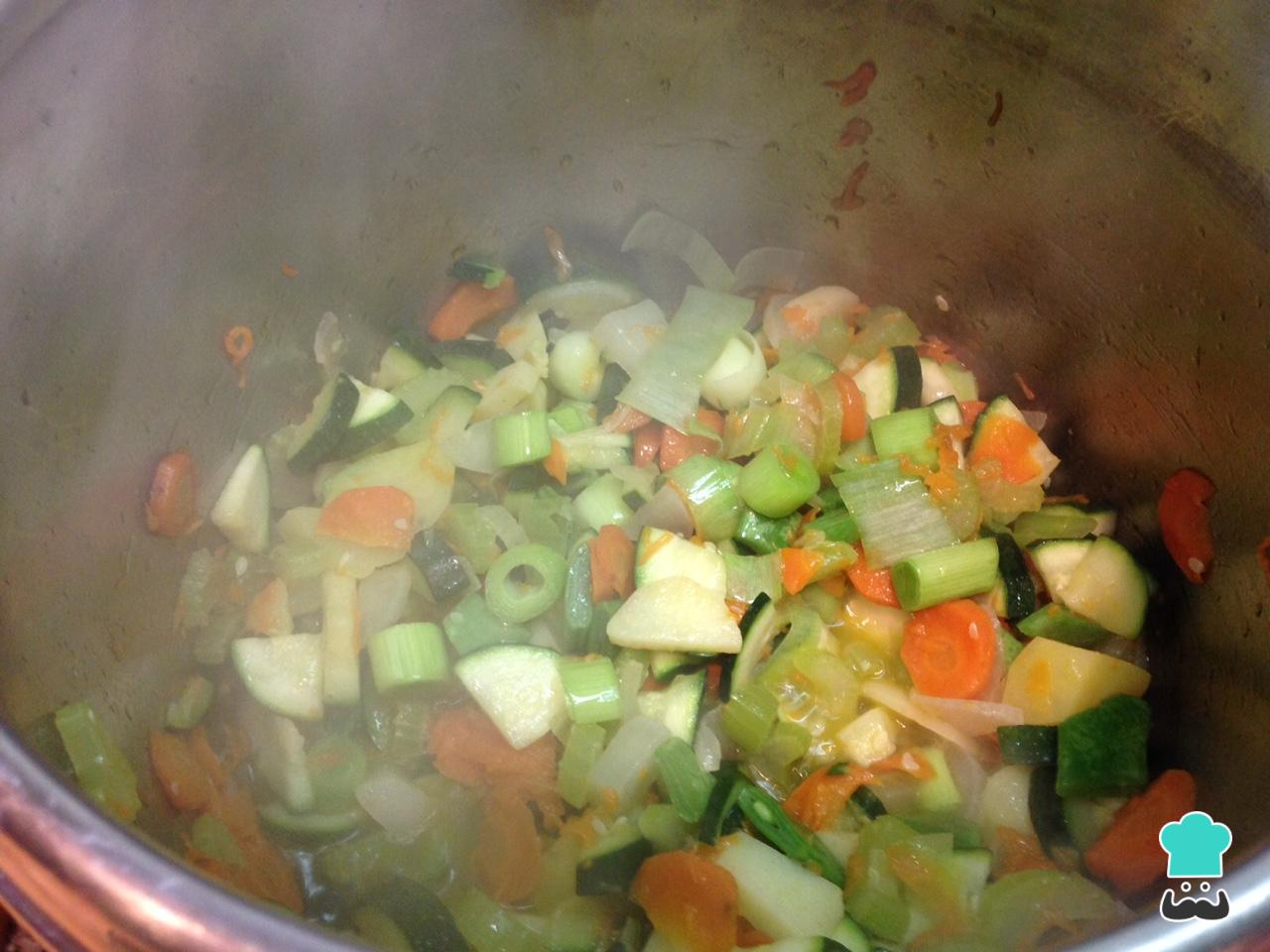 Pasados unos minutos añadiremos el resto de las verduras, previamente lavadas y troceadas. Lo ideal es introducir primero las verduras que necesitan más cocción, para añadir en último lugar, por ejemplo, el puerro o el calabacín.