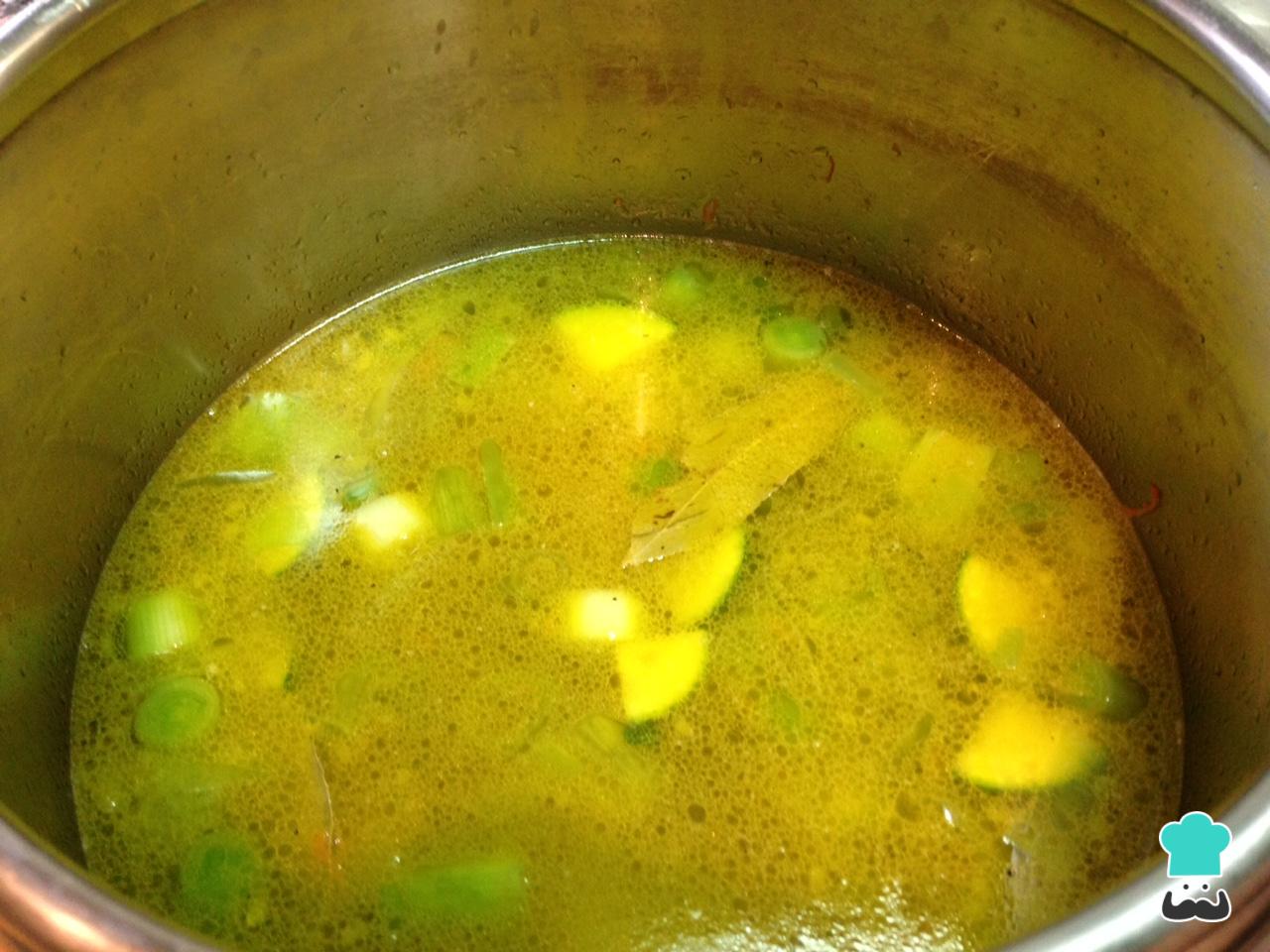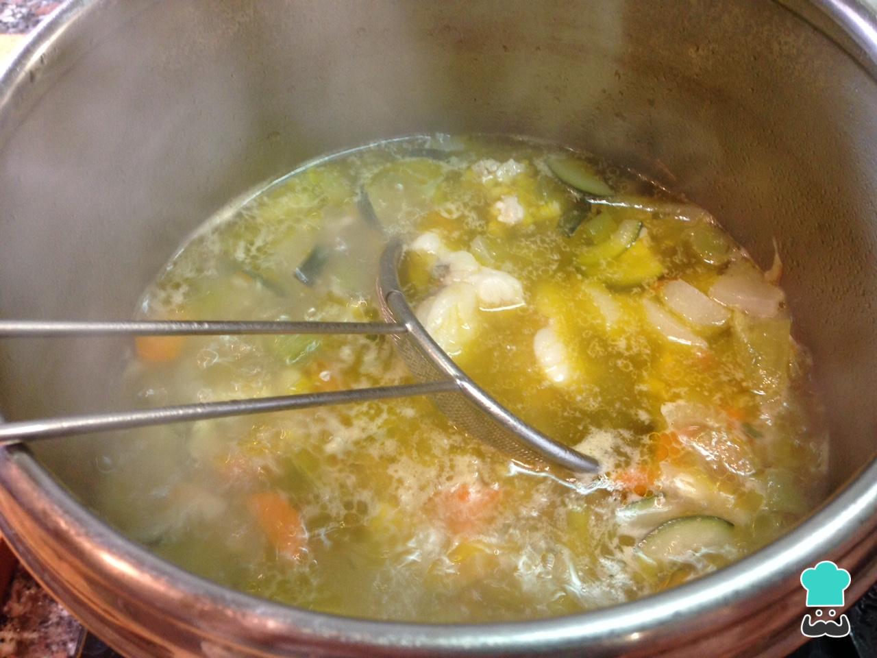 Pasados unos minutos más de cocción, el rape y el bonito estarán perfectamente cocinados y habrán desprendido sus sabores en la sopa de verdura.