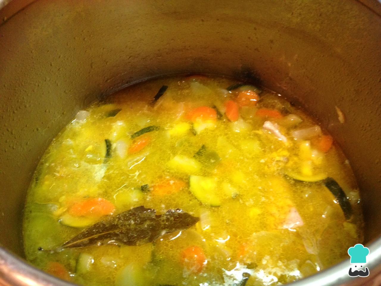 Cuando las verduras ya estén medio hechas, añadiremos agua, unos dos litros, para hacer el caldo de verduras. Es el momento también de salpimentar al gusto y de introducir las hojas de laurel. Removiendo de vez en cuando, dejaremos que se cueza durante un mínimo de 10 minutos, aunque en este tipo de recetas cuánto más larga sea la cocción más sabroso queda el caldo.