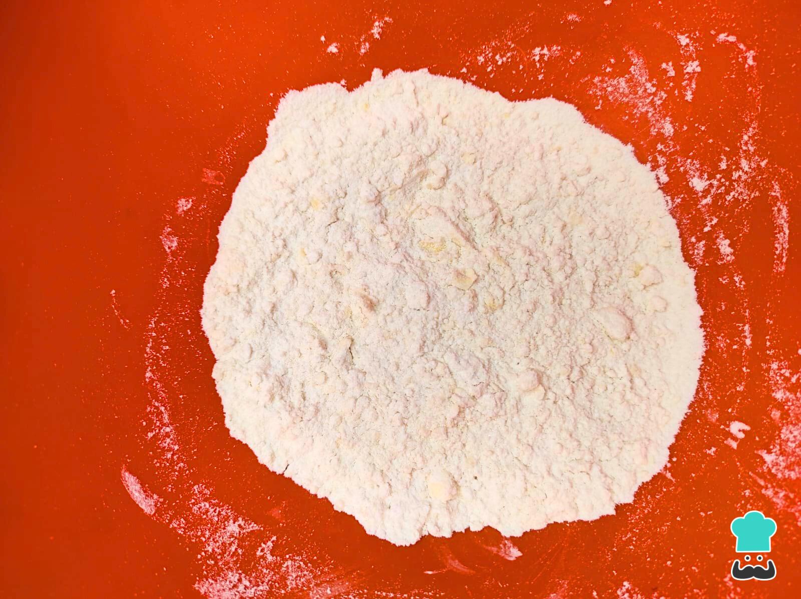 En un bol grande mezcla la harina, polvos de hornear, sal y mantequilla o margarina. Integra con las manos, quedará una textura arenosa.