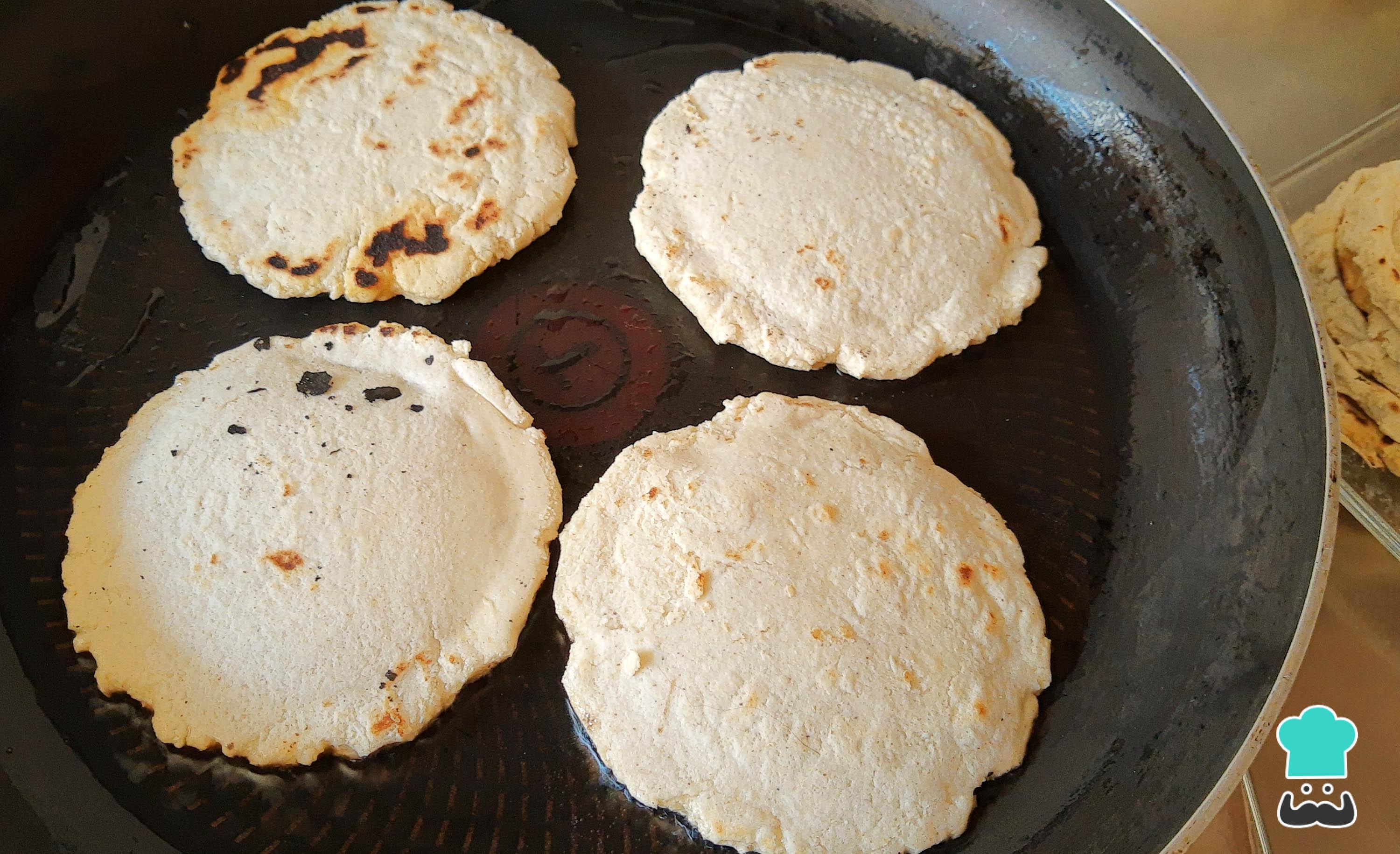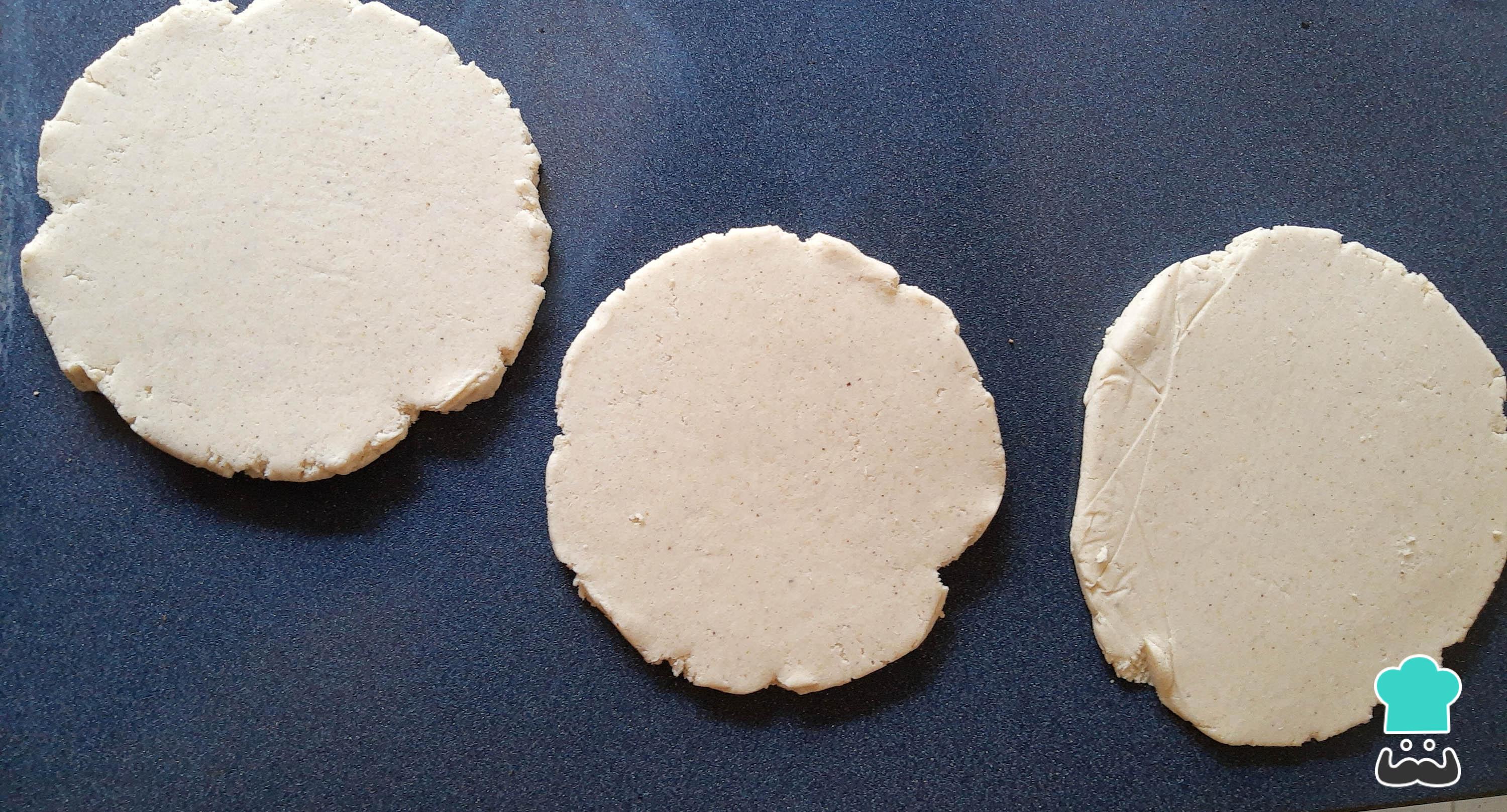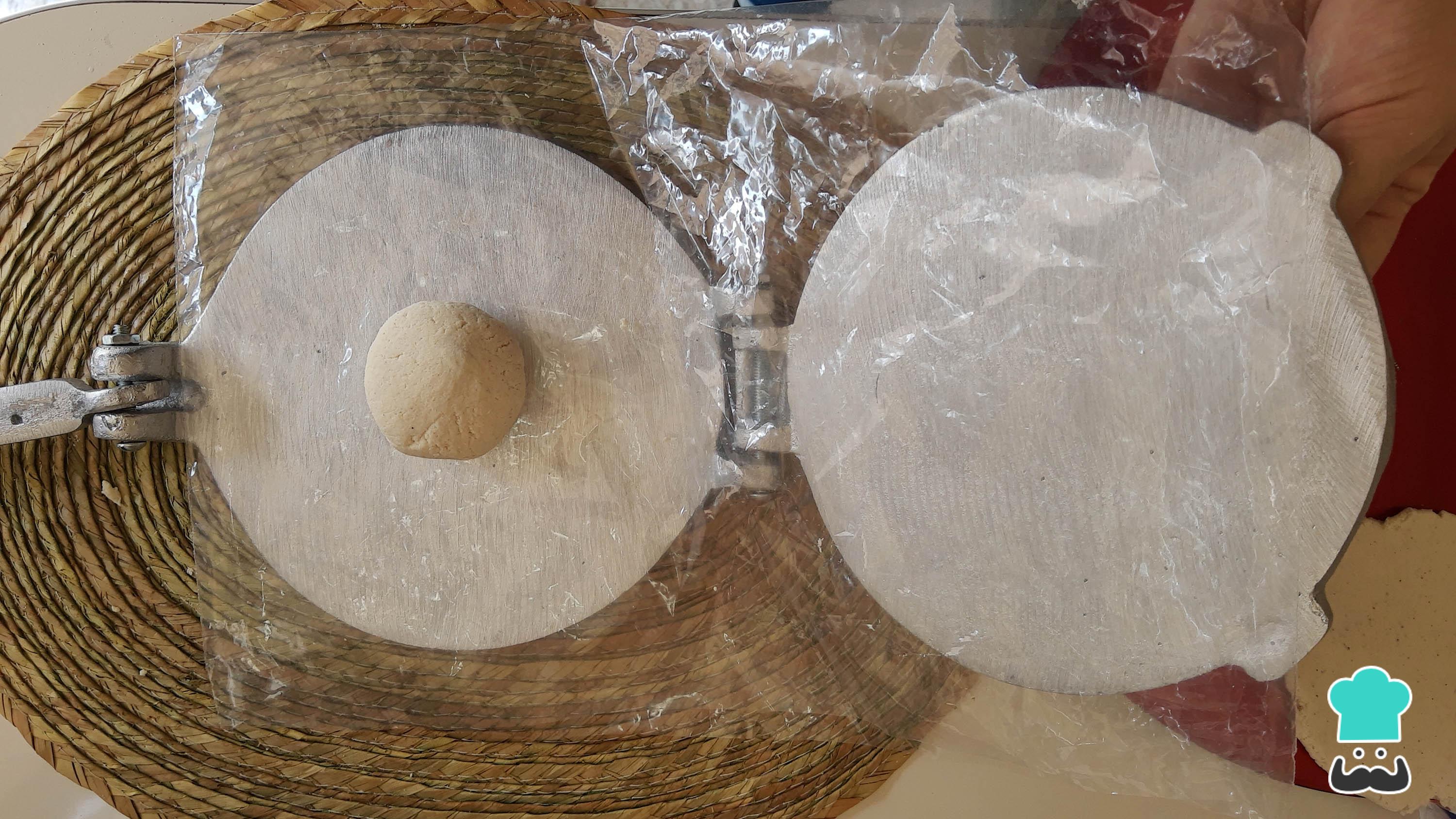 Divide en porciones de aproximadamente 30 gramos y, con ayuda de una prensa para tortillas, aplasta sin que quede muy delgada.