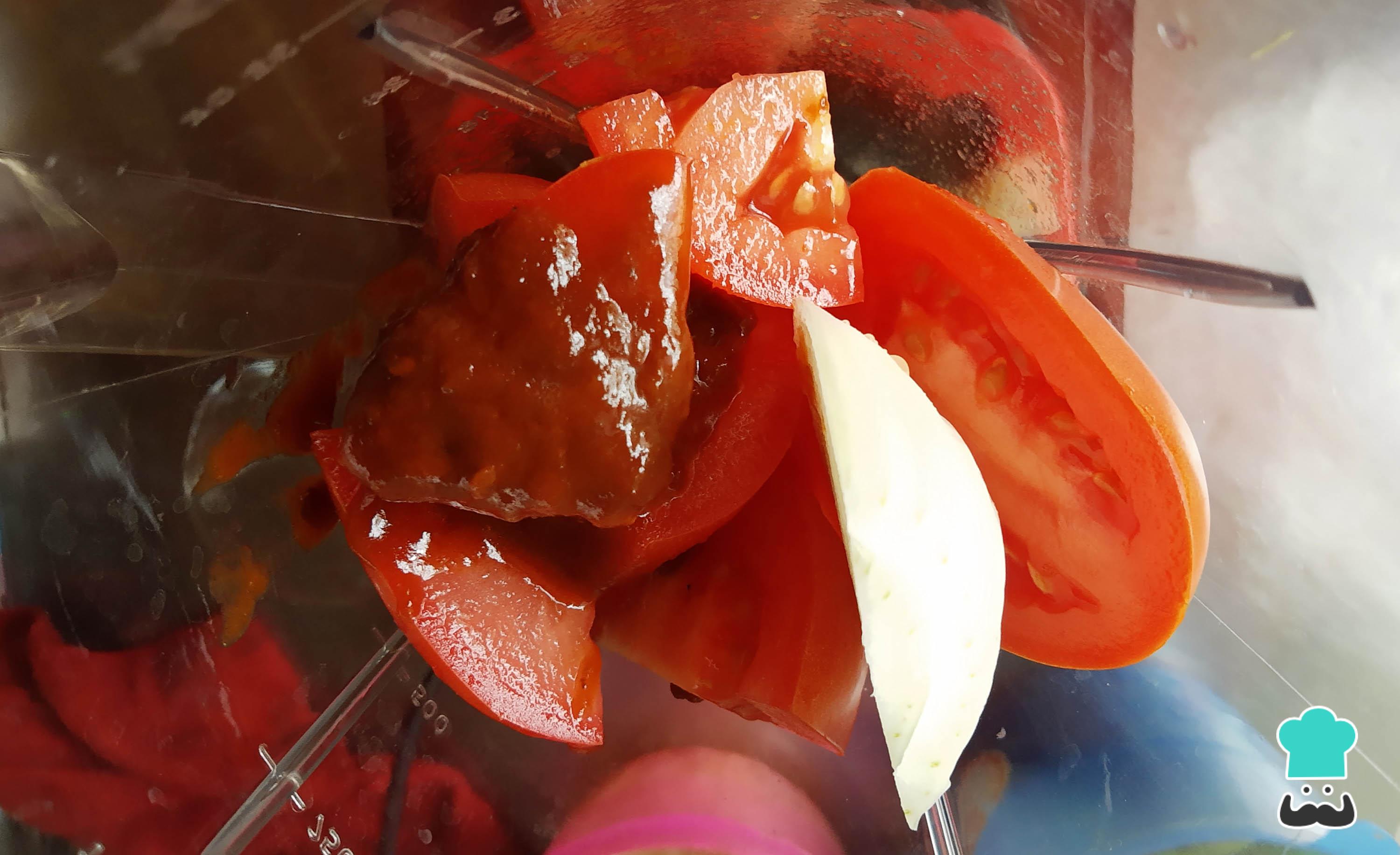 Licua las piezas de jitomate, el trozo de cebolla, el diente de ajo y el chile chipotle si quieres que pique un poco. Agrega un poquito de agua para facilitar el licuado.