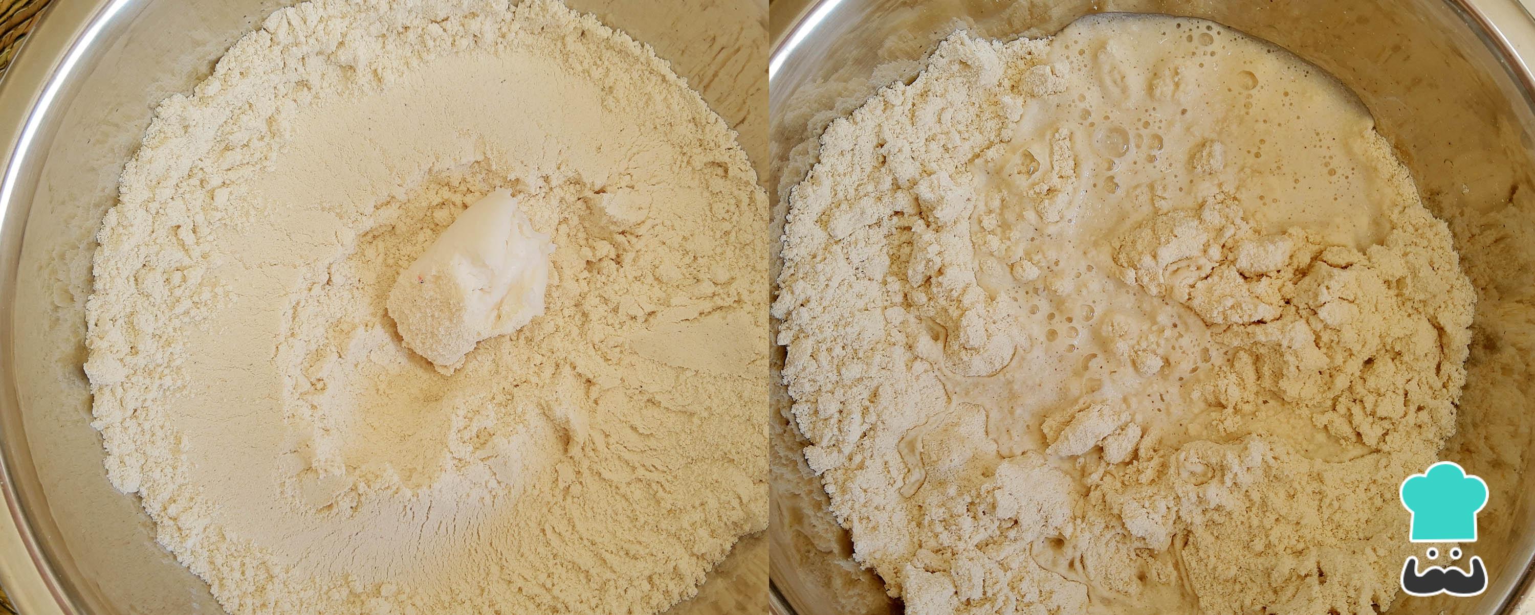 Añade la manteca vegetal o manteca de cerdo y comienza a amasar. Gradualmente, vierte el agua y sigue amasando hasta obtener una masa manejable sin que se pegue.