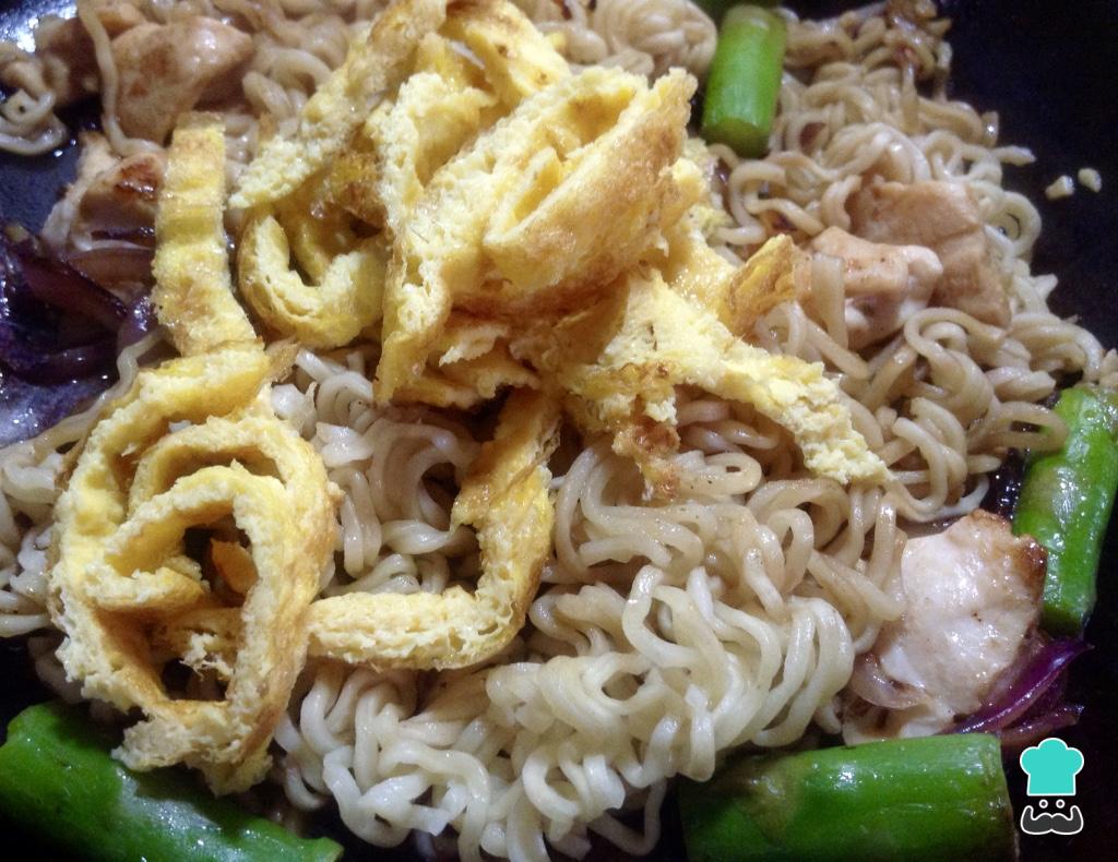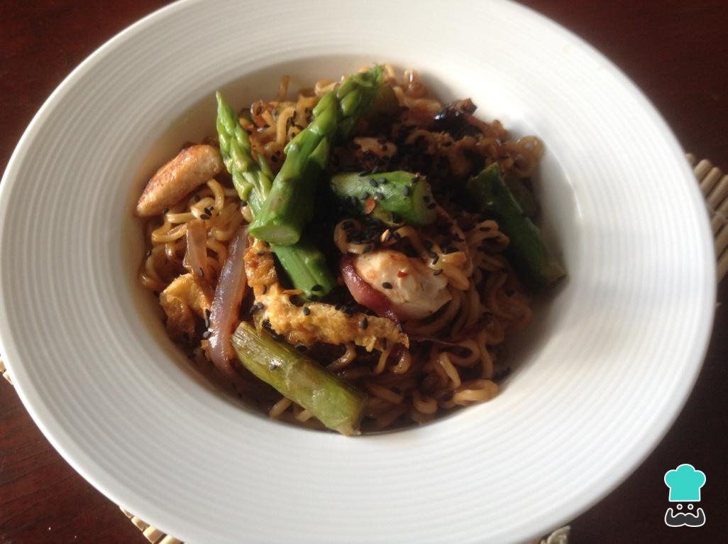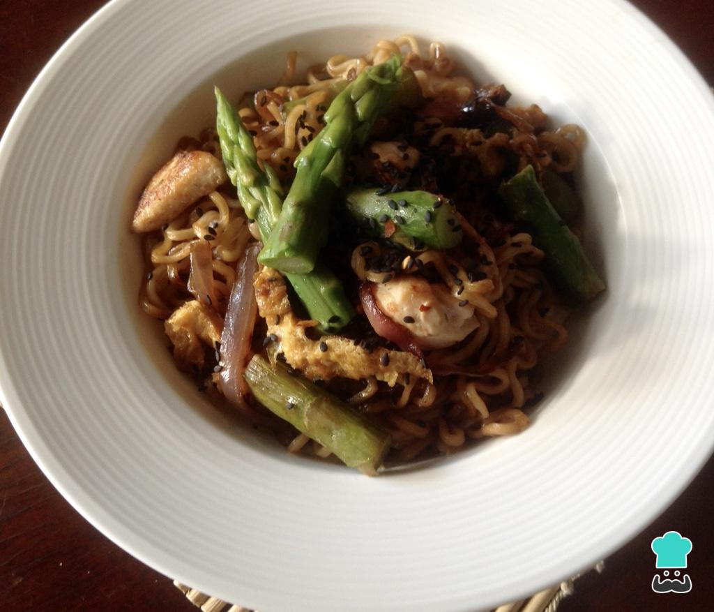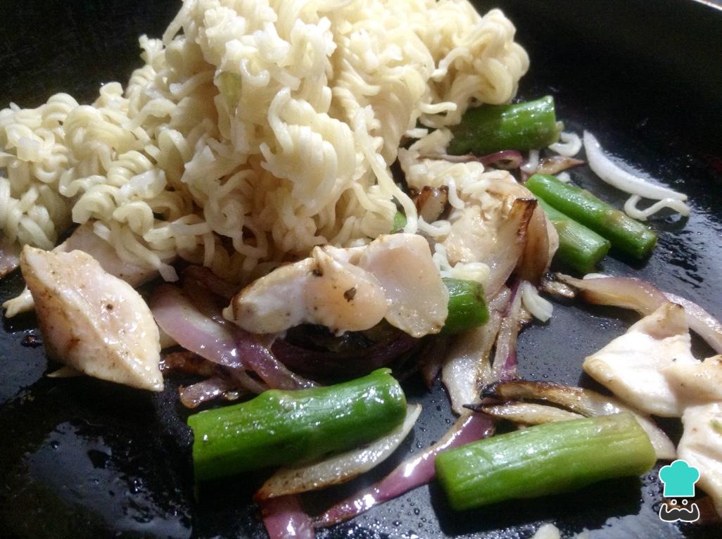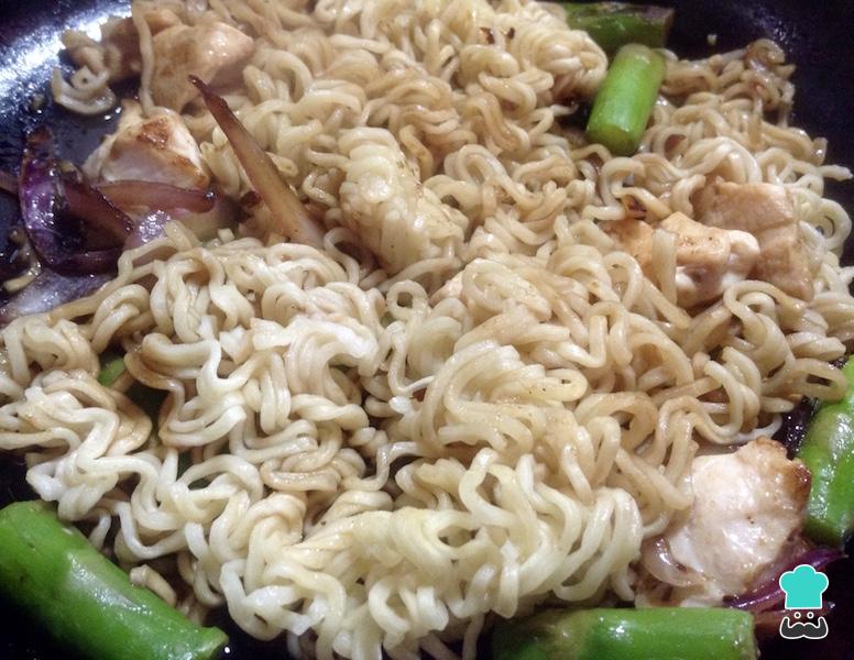 Lleva nuevamente al wok el resto de aceite de sésamo, añade el pollo con la cebolla, los espárragos cocinados y los noodles. Mezcla bien y saltea durante algunos minutos para que se integren los ingredientes.