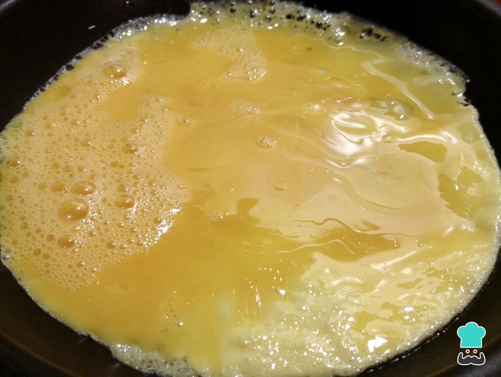 Cuando tengas todo listo, lo primero que tienes que hacer es batir los huevos. Luego, lleva una sartén a fuego medio y adiciona un poco de aceite. Una vez caliente, cocina varias tortillas con los huevos batidos, bien delgadas pero enteras. Reserva las tortillas.
