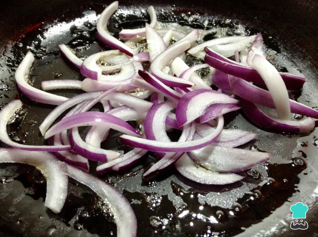 Lleva el wok a fuego medio y adiciona una cucharada de aceite de sésamo o ajonjolí. Cuando esté caliente, saltea la cebolla roja cortada en plumas recuerda, sin dejar de mover para evitar que se queme.